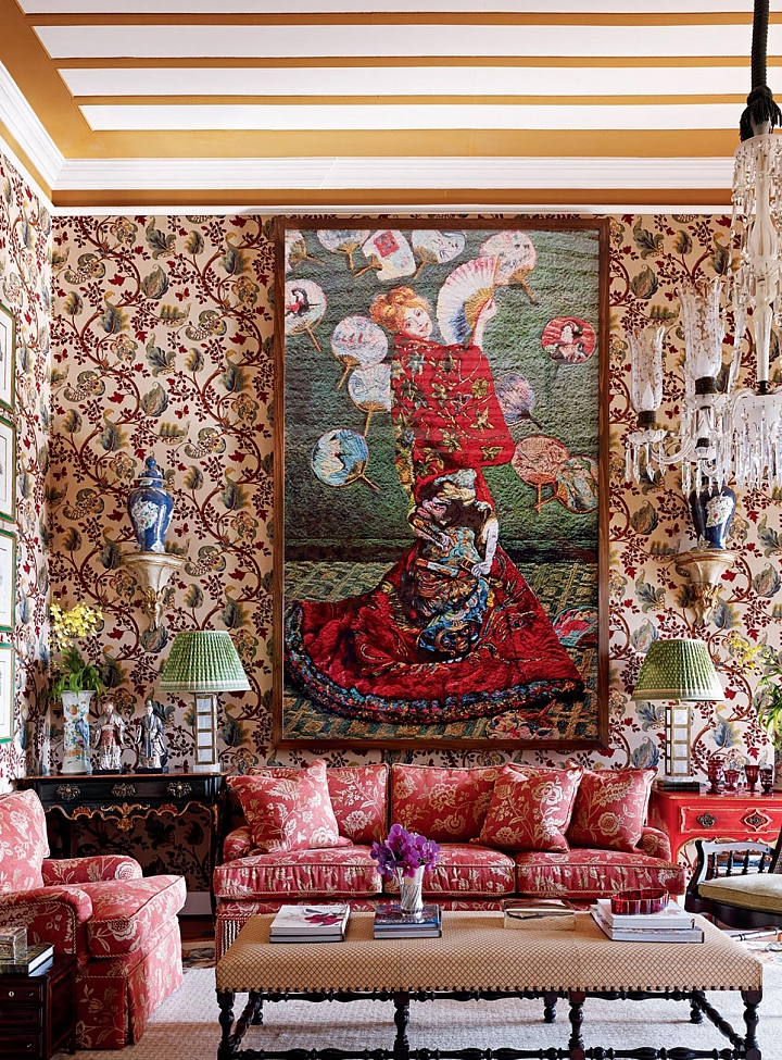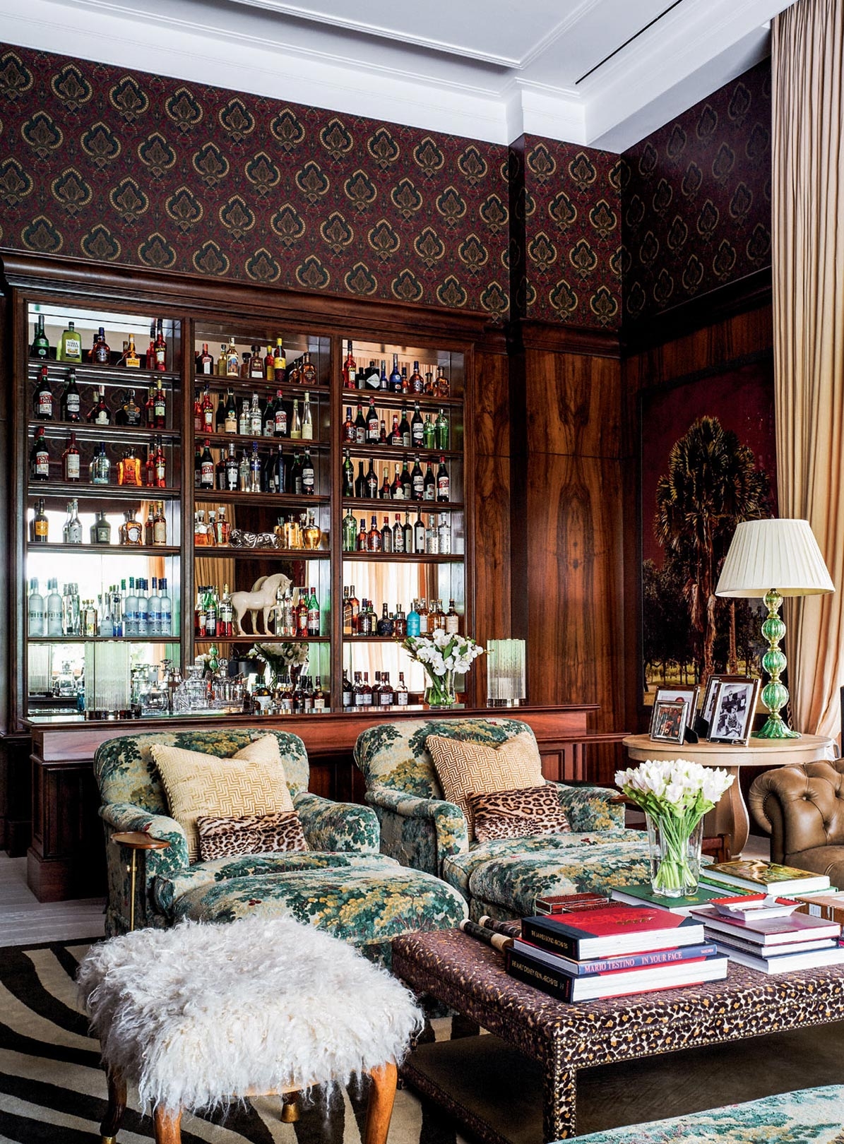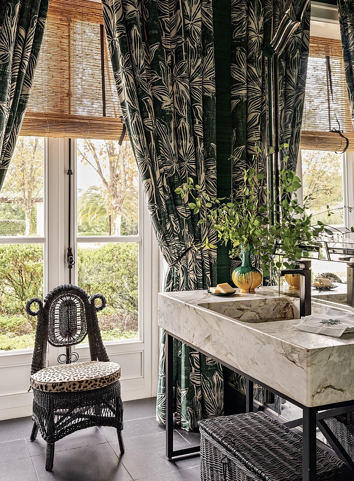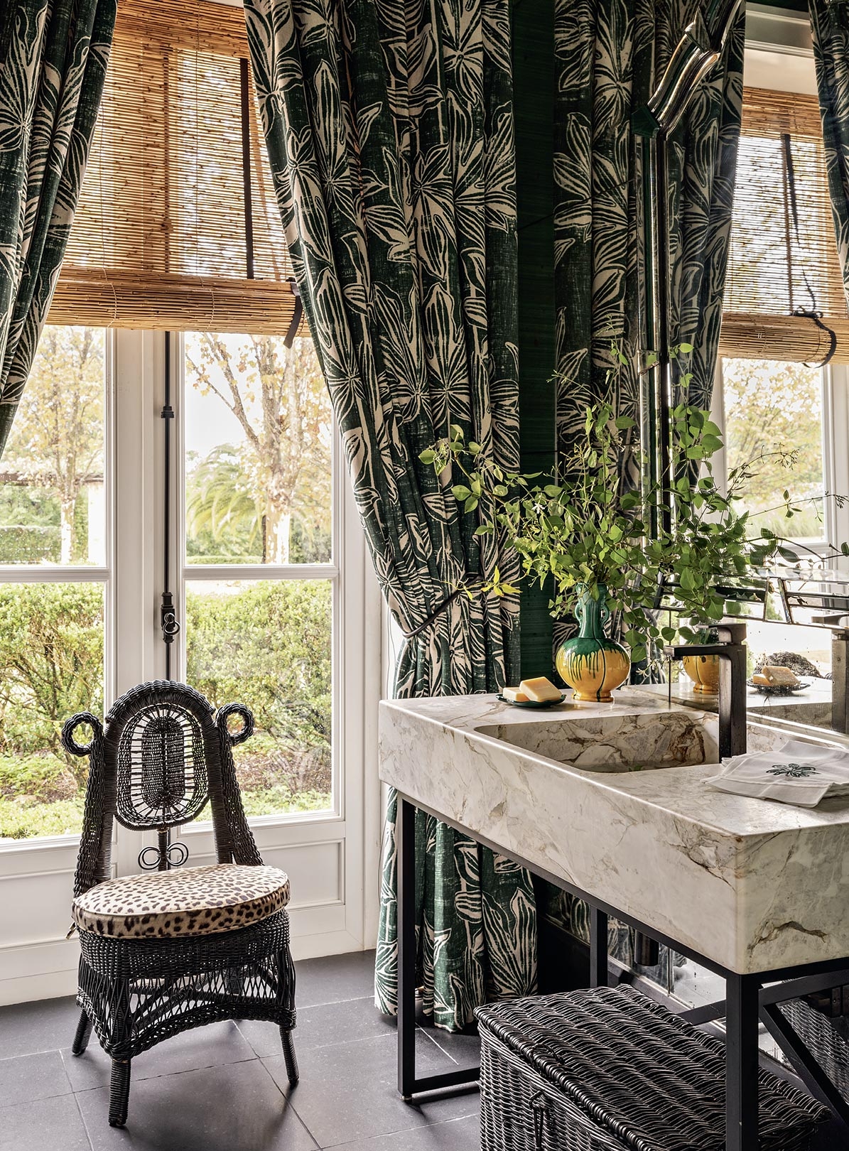Sempre há folhagens ou flores, uma camada a mais que ajuda até uma casa recém-construída a parecer vivida. Ele adora estampas, mas não precisa que sejam gritantes; usa com confiança xadrezes, animais e estampas abstratas dentro de uma residência.