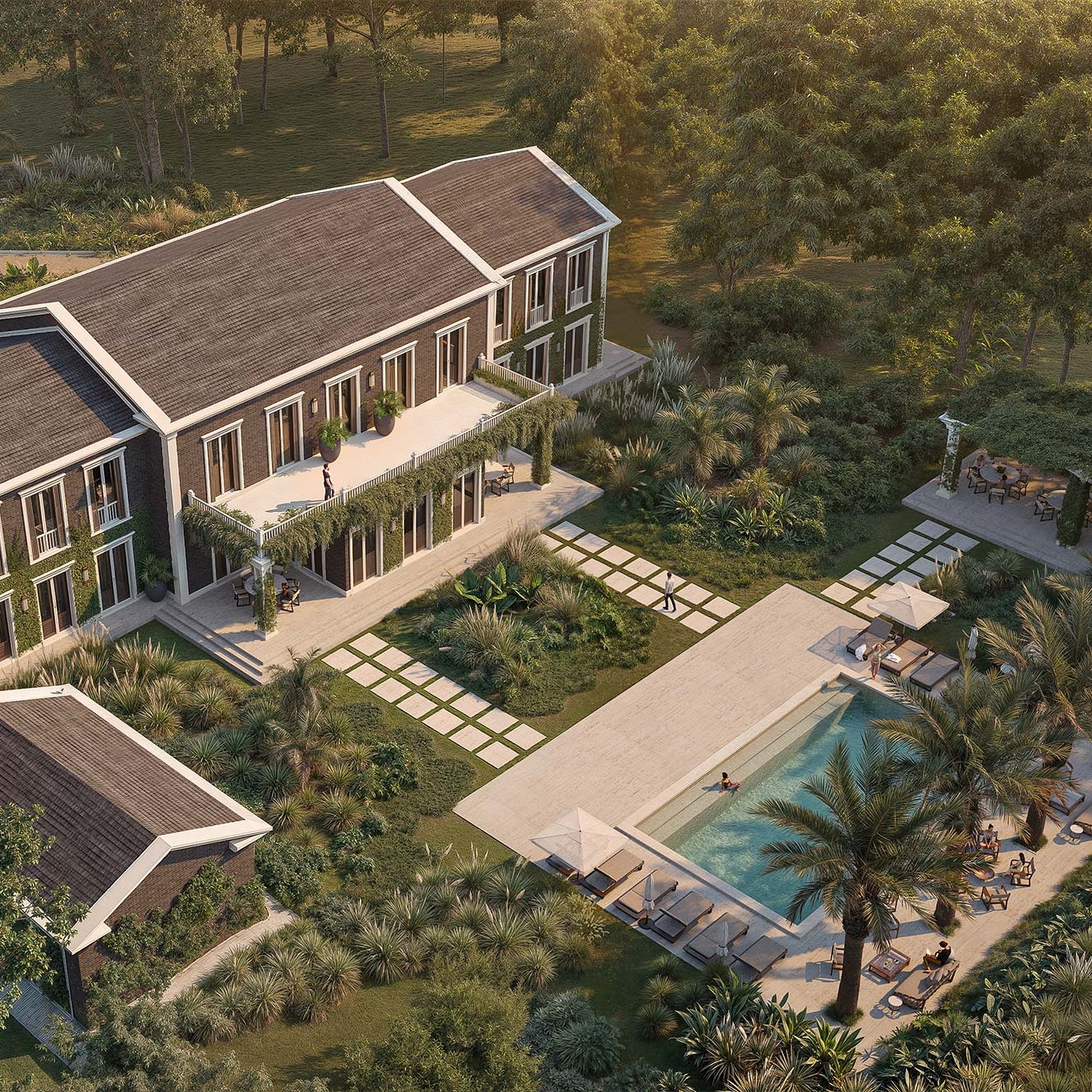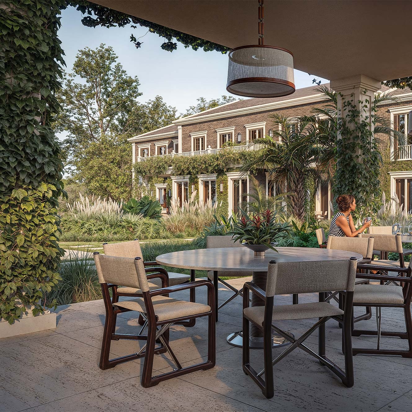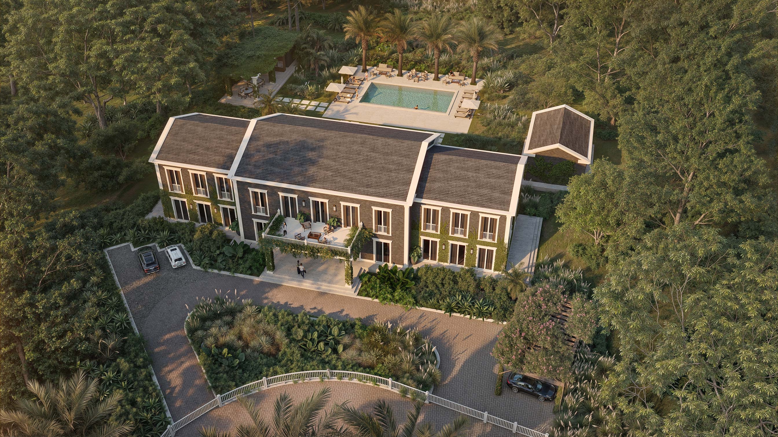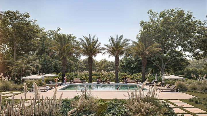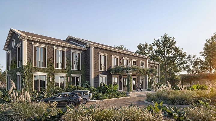 This residence, located within Boa Vista Estates in Porto Feliz, adopts a language of contemporary classical architecture, structured around compositional rigor, tectonic clarity, and controlled proportion. The project is organized through an axial and symmetrical parti, articulated in a two-storey longitudinal volume, with façades defined by a regular rhythm of openings, pronounced cornices, and a clear formal hierarchy. The vertical planes are defined by dark handmade clay brick (architectural facing brick), whose artisanal texture lends depth and material density to the composition. Lighter-toned elements such as moldings, pilasters, and friezes operate as formal articulation devices, reinforcing the three-dimensional reading of the elevations. Colonnades, deep verandas, and covered galleries structure the transition between interior and exterior, forming a sequence of intermediate spaces that enhance use and environmental comfort. The integration of vegetation into the architecture, together with the precise design of the external spaces, consolidates a residence of timeless character, where order, permanence, and spatial refinement define the experience of the project.