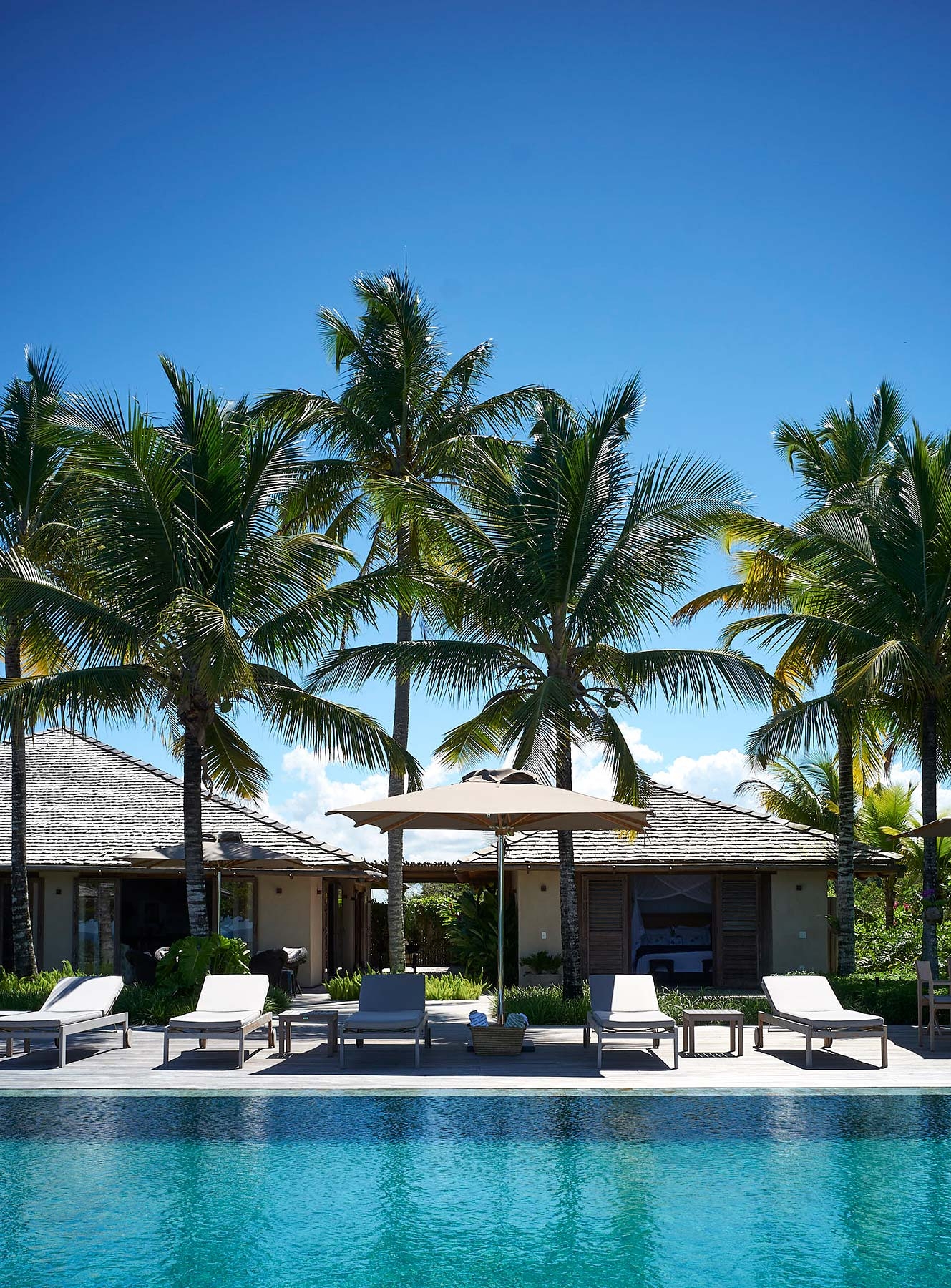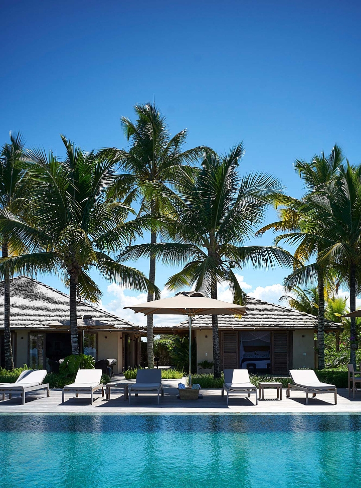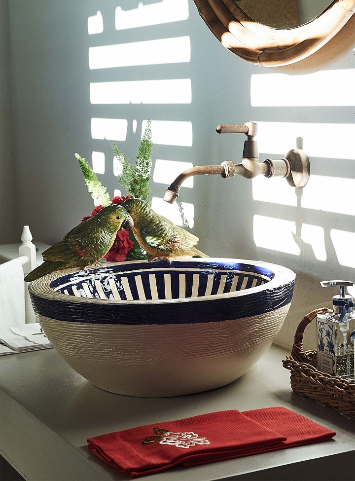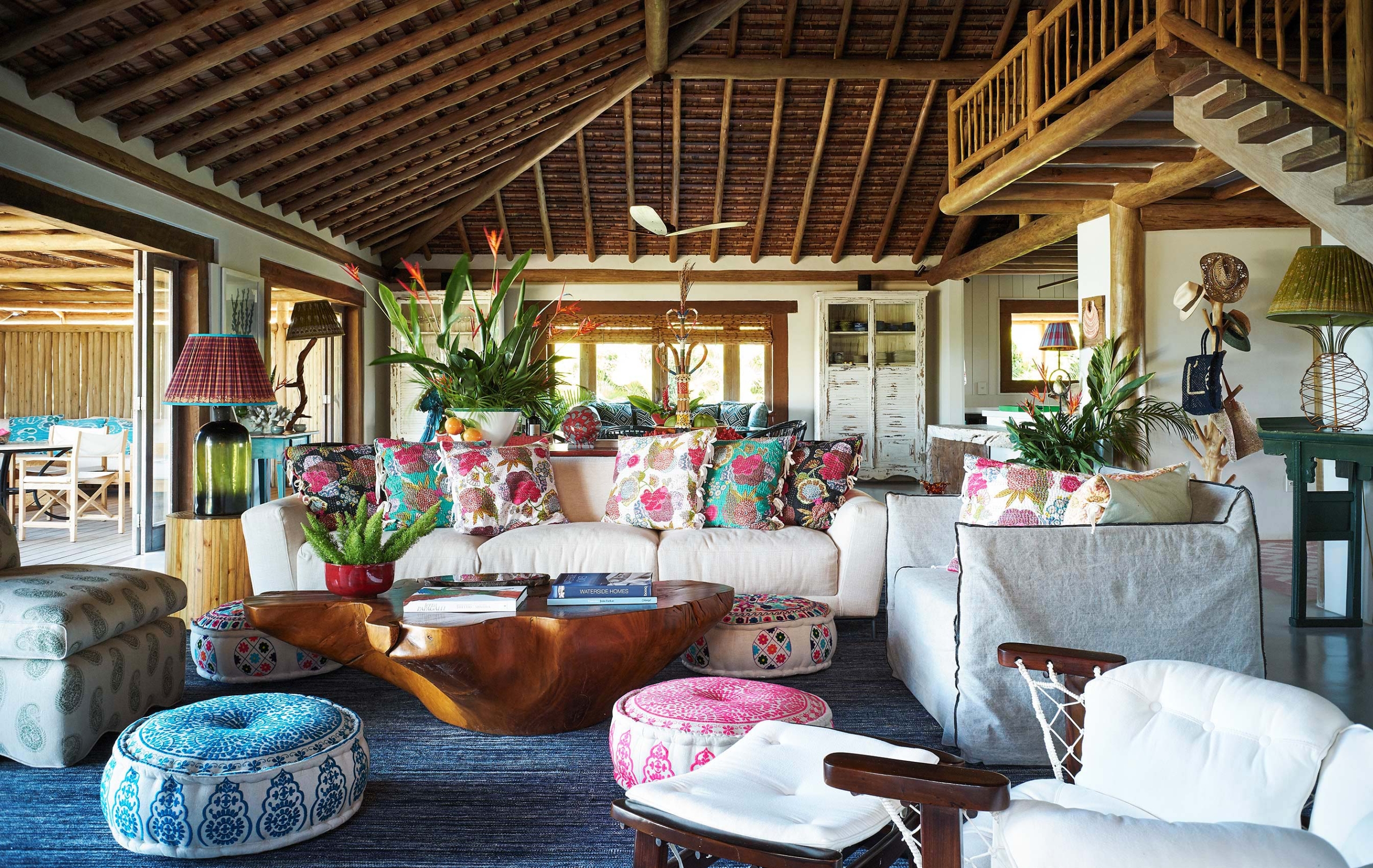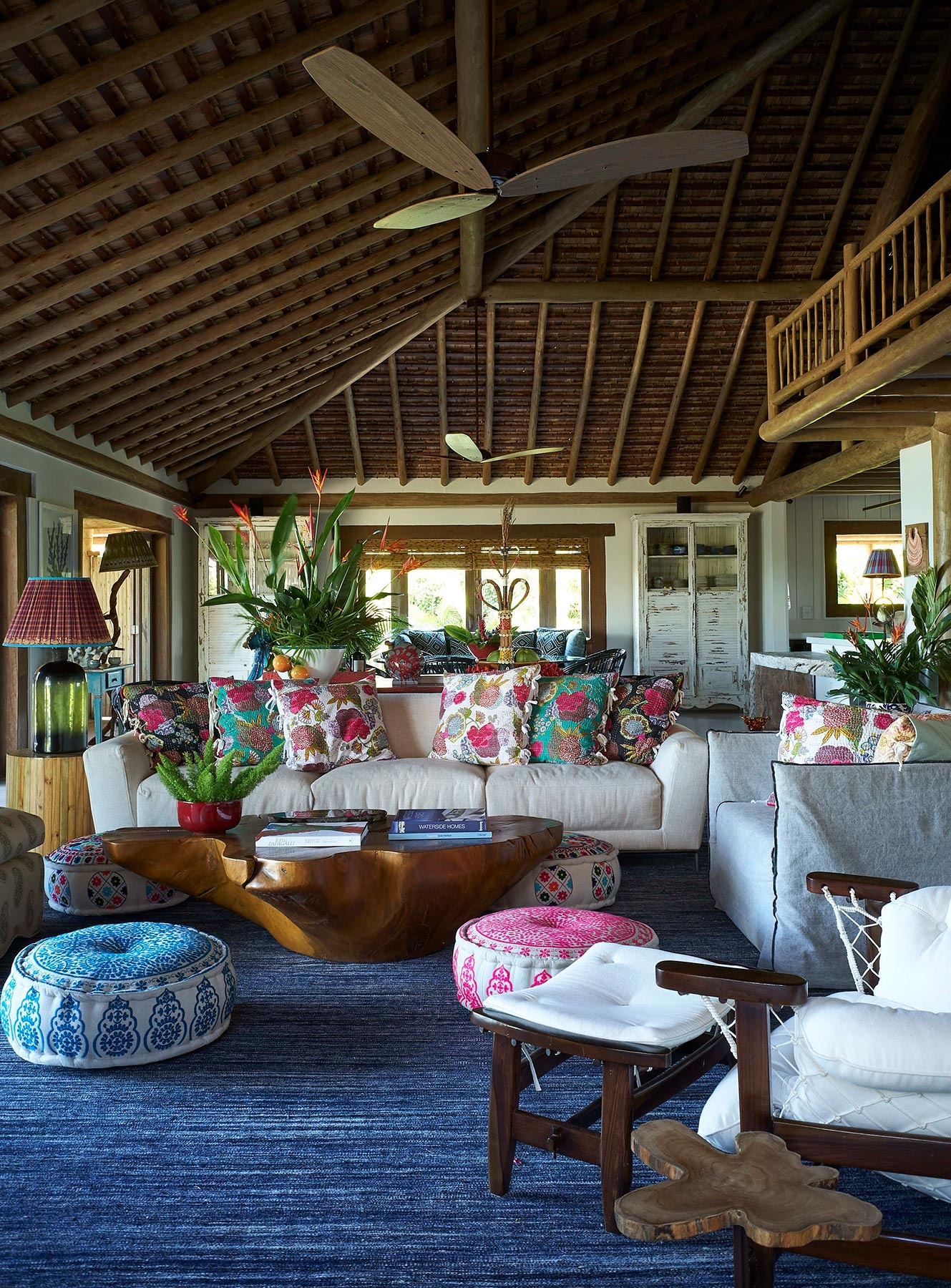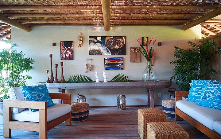 In Trancoso, this beachfront home begins with a clear premise: letting tropical architecture shape the way of living. Exposed timber structure, cross ventilation, and fluid transitions between indoors and outdoors keep the house in continuous dialogue with the landscape. A roof built from rustic timber logs establishes the material vocabulary from the moment of arrival. Inside, the language combines Brazilian modernism, craftsmanship, and everyday use with precise editing. In the main living room, generous upholstery is layered with ikats and ethnic florals, composed with white linen and tapestry. The curation brings together Brazilian design pieces, including an armchair by Sergio Rodrigues, patinated millwork, solid-wood furniture, handwoven textures, organically shaped tables, and collected objects. Wicker, basketry, and contemporary Brazilian design enter as a counterpoint of texture and scale. Natural-fiber rugs, often layered over kilims, organize the rooms; bamboo shades filter the light and reinforce the beachside atmosphere. A palette of white, blue, and controlled accents extends the reading of the surroundings. In the powder room, a handcrafted ceramic sink with hand-applied glazing and figurative elements takes center stage, set against classically designed metal fixtures. The result is a home where architecture and interiors operate as a single system, rustic in materiality, precise in curation, and deeply connected to place.