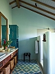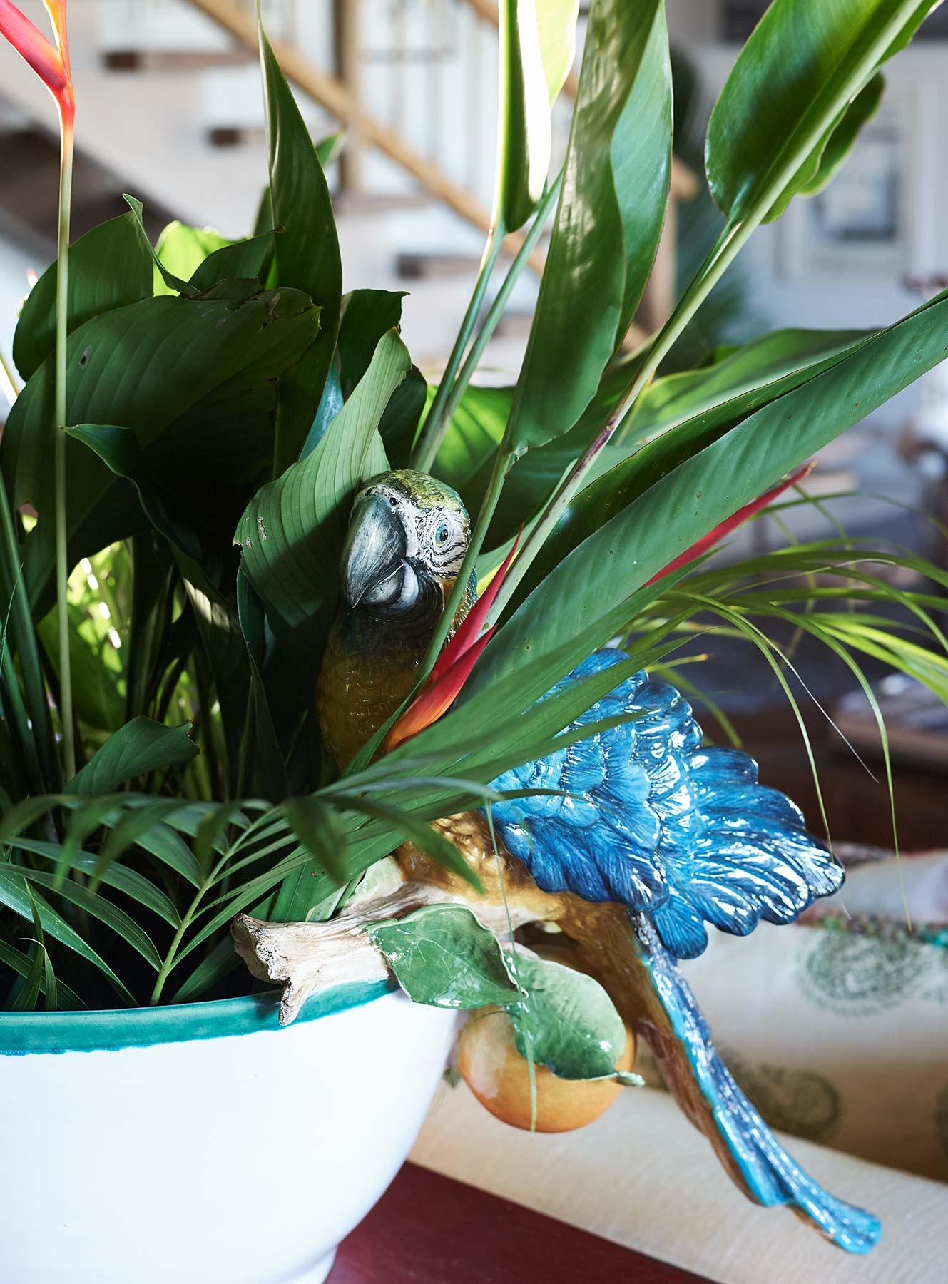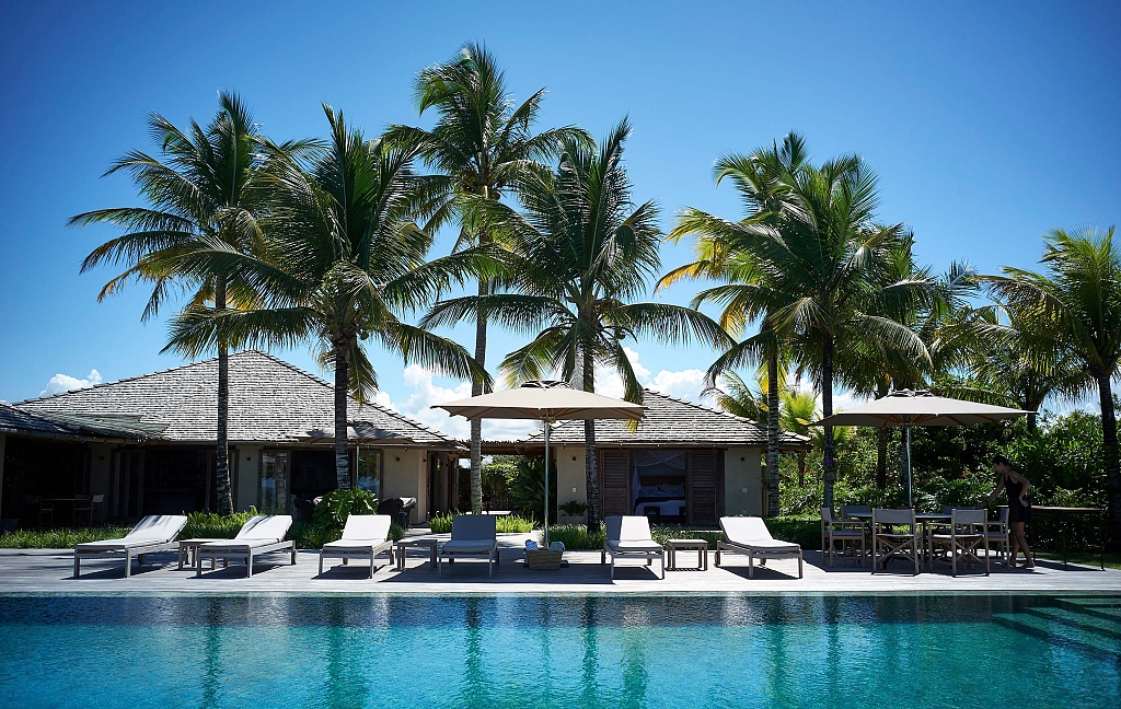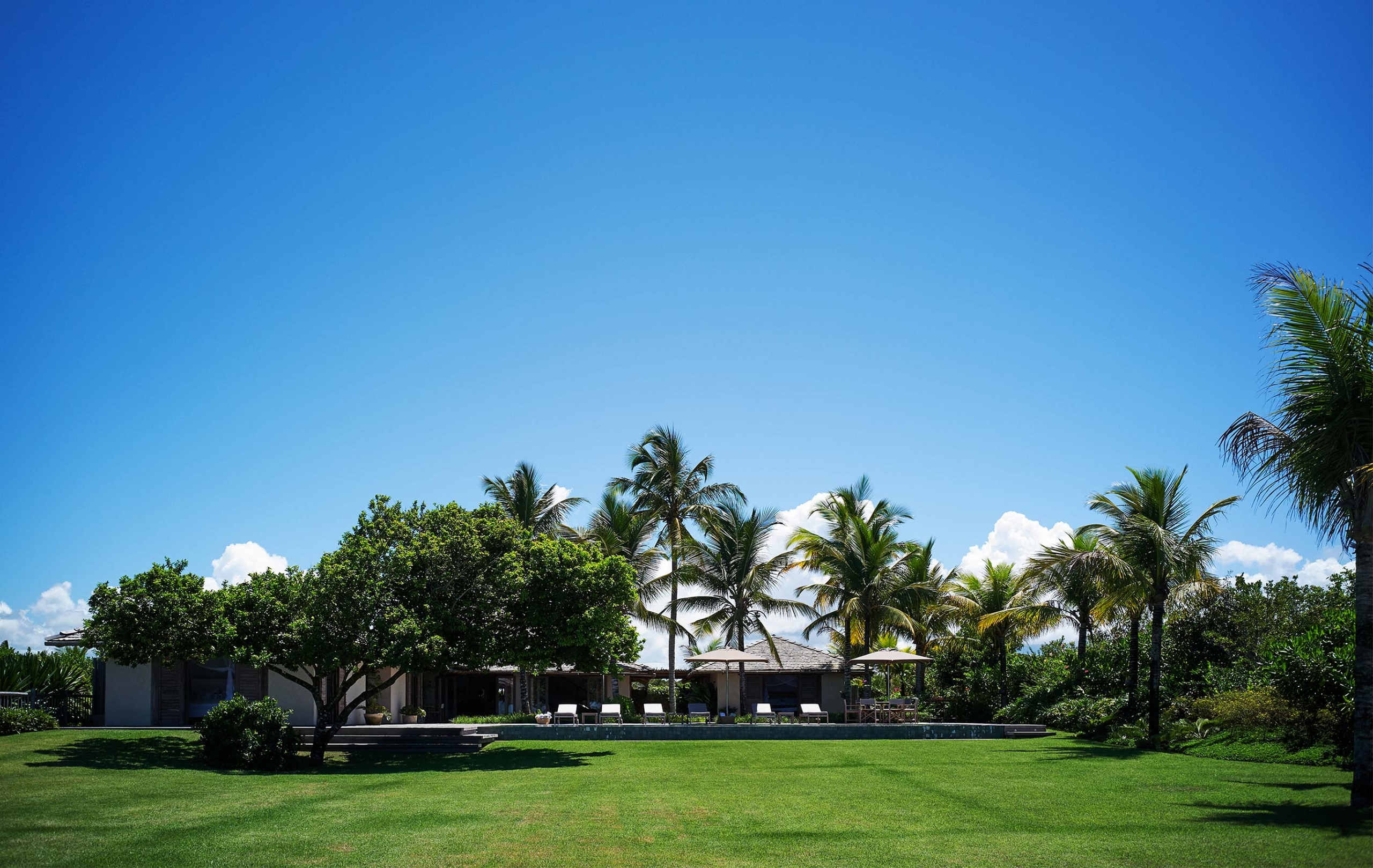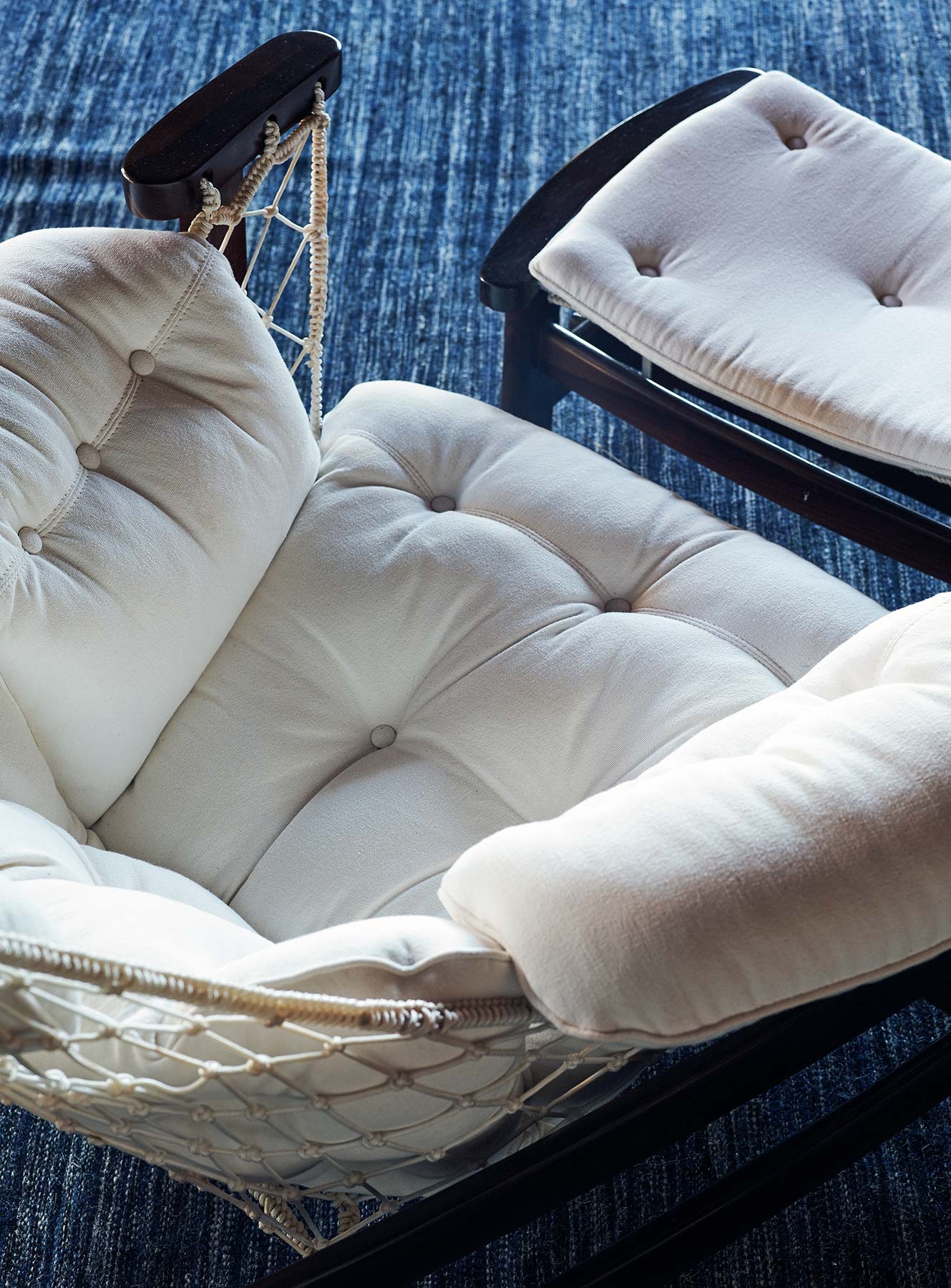 In Trancoso, this beachfront home begins with a clear premise: letting tropical architecture shape the way of living. Exposed timber structure, cross ventilation, and fluid transitions between indoors and outdoors keep the house in continuous dialogue with the landscape. A roof built from rustic timber logs establishes the material vocabulary from the moment of arrival. Inside, the language combines Brazilian modernism, craftsmanship, and everyday use with precise editing. In the main living room, generous upholstery is layered with ikats and ethnic florals, composed with white linen and tapestry. The curation brings together Brazilian design pieces, including an armchair by Sergio Rodrigues, patinated millwork, solid-wood furniture, handwoven textures, organically shaped tables, and collected objects. Wicker, basketry, and contemporary Brazilian design enter as a counterpoint of texture and scale. Natural-fiber rugs, often layered over kilims, organize the rooms; bamboo shades filter the light and reinforce the beachside atmosphere. A palette of white, blue, and controlled accents extends the reading of the surroundings. In the powder room, a handcrafted ceramic sink with hand-applied glazing and figurative elements takes center stage, set against classically designed metal fixtures. The result is a home where architecture and interiors operate as a single system, rustic in materiality, precise in curation, and deeply connected to place.
