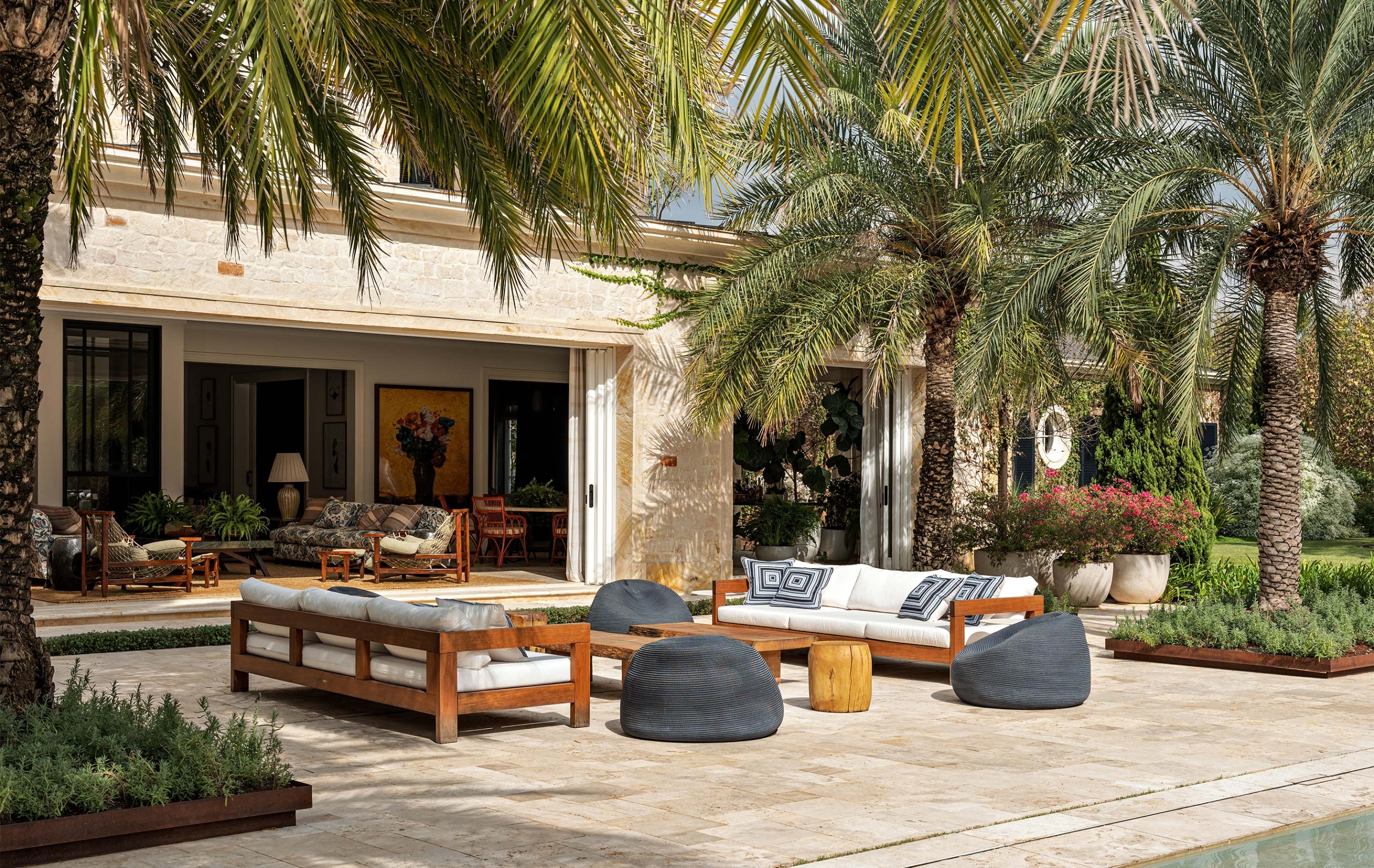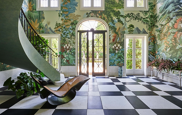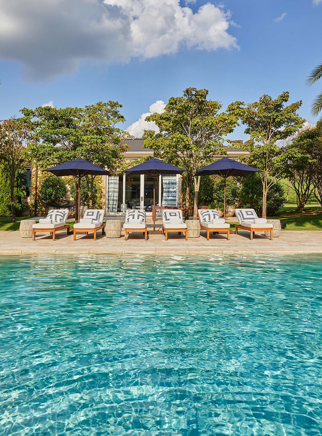 Set within the landscape of Fazenda Boa Vista, Vila Sole organizes its interior design through a dialogue between classical European references and Brazilian design, structuring art, furniture, and materials in continuity with the architecture. The entrance hall establishes the tone of the house with L’EDEN wallpaper by de Gournay, which envelops the space, while a black-and-white marble floor in a traditional checkerboard pattern introduces a graphic, classical foundation. The Rio chaise by Oscar Niemeyer serves as the focal point, and the space was selected to appear in Eclectic by Sig Bergamin, published by Assouline. In the social areas, integration with the garden guides the layout, combining upholstered pieces with furniture by Jader Almeida and Sergio Rodrigues, alongside sisal rugs, handcrafted ceramics, and collected objects. The art curation includes works by Mariana Palma and Cássio Vasconcellos. The dining room features woven-fiber and wood chairs, while the bedrooms maintain floral wallpapers, solid wood furniture, and quilted check textiles. In the pool area, wooden furnishings and geometric blue fabrics extend the living spaces outdoors, consolidating a language defined by proportion, materiality, and careful editing.