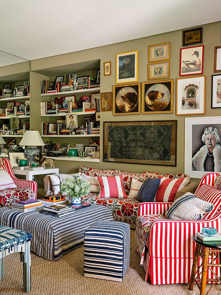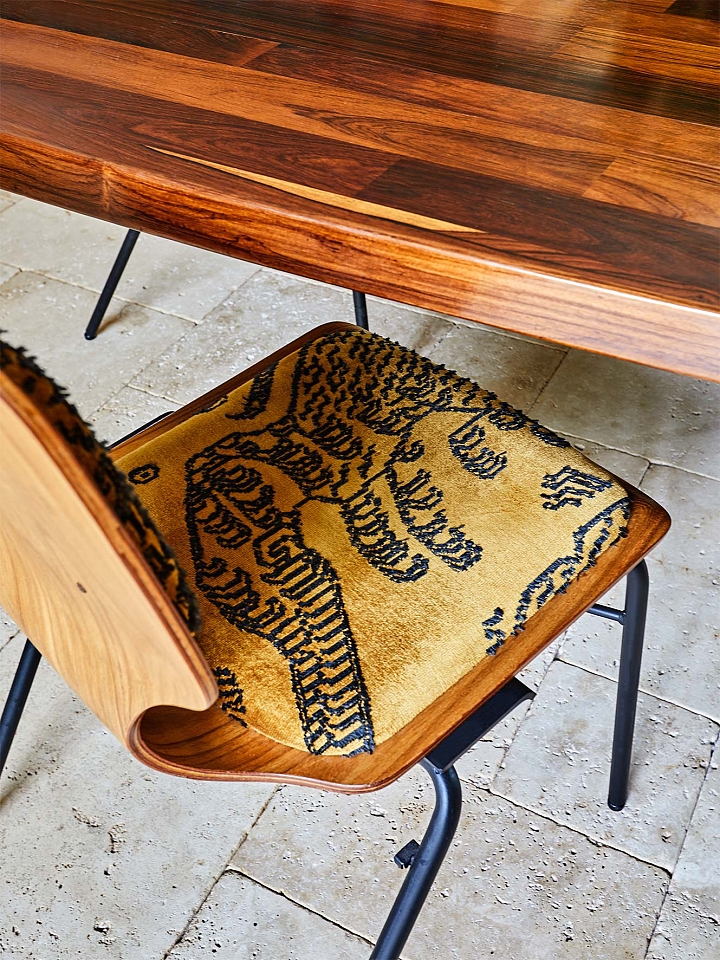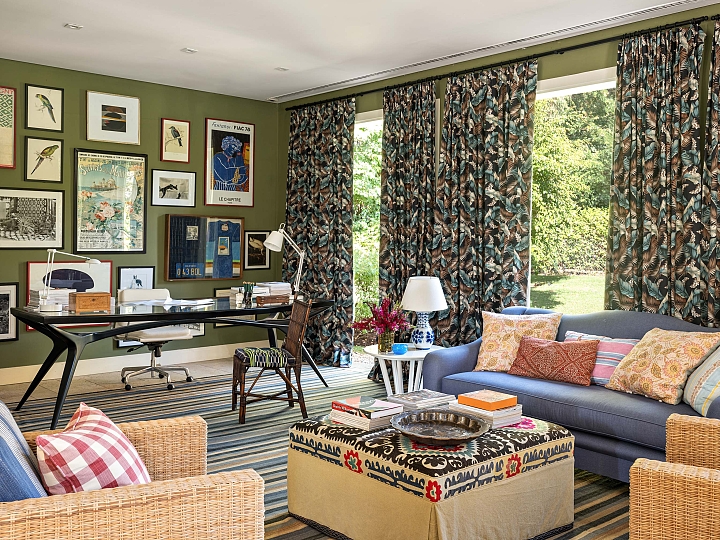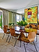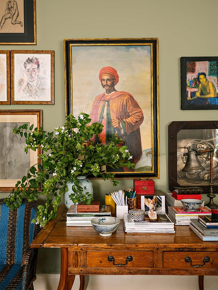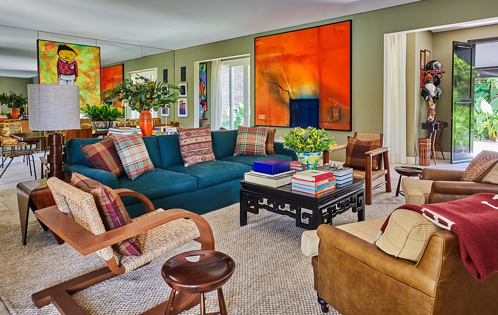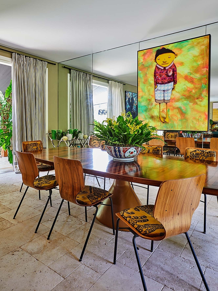 O projeto parte do repertório das casas de campo inglesas, reinterpretado por Sig Bergamin e Murilo Lomas em uma leitura contemporânea de conforto e vida ao ar livre. Desenvolvida em um único nível, a implantação privilegia a fluidez entre interior e exterior e reforça a relação direta com o jardim. A fachada em tijolos aparentes estabelece um caráter clássico, inserindo a arquitetura na paisagem. No interior, uma paleta de verdes e beges funciona como base para uma curadoria que combina arte, design e peças artesanais. Grandes pinturas contemporâneas convivem com composições de objetos, mobiliário autoral e achados de antiquário, construindo ambientes que revelam repertório e memória. No living, poltronas On e a chaise Marquesa dialogam com obras de Bruno Dunley e Rodrigo Bivar, enquanto peças de Armani Casa, Ralph Lauren e Jonathan Adler se misturam a mobiliário vintage, estruturando a composição visual. Biblioteca e áreas sociais reforçam essa sobreposição de tempos e estilos, onde o interiorismo atua como extensão da arquitetura. Externamente, cadeiras e espreguiçadeiras de metal preto com tecidos listrados organizam a área da piscina linear, integrando-se ao paisagismo de Maria João D’Orey. O conjunto define uma casa pensada para o convívio, onde arquitetura, interiores e jardim operam de forma contínua, traduzindo um modo de morar informal, sofisticado e conectado à natureza.