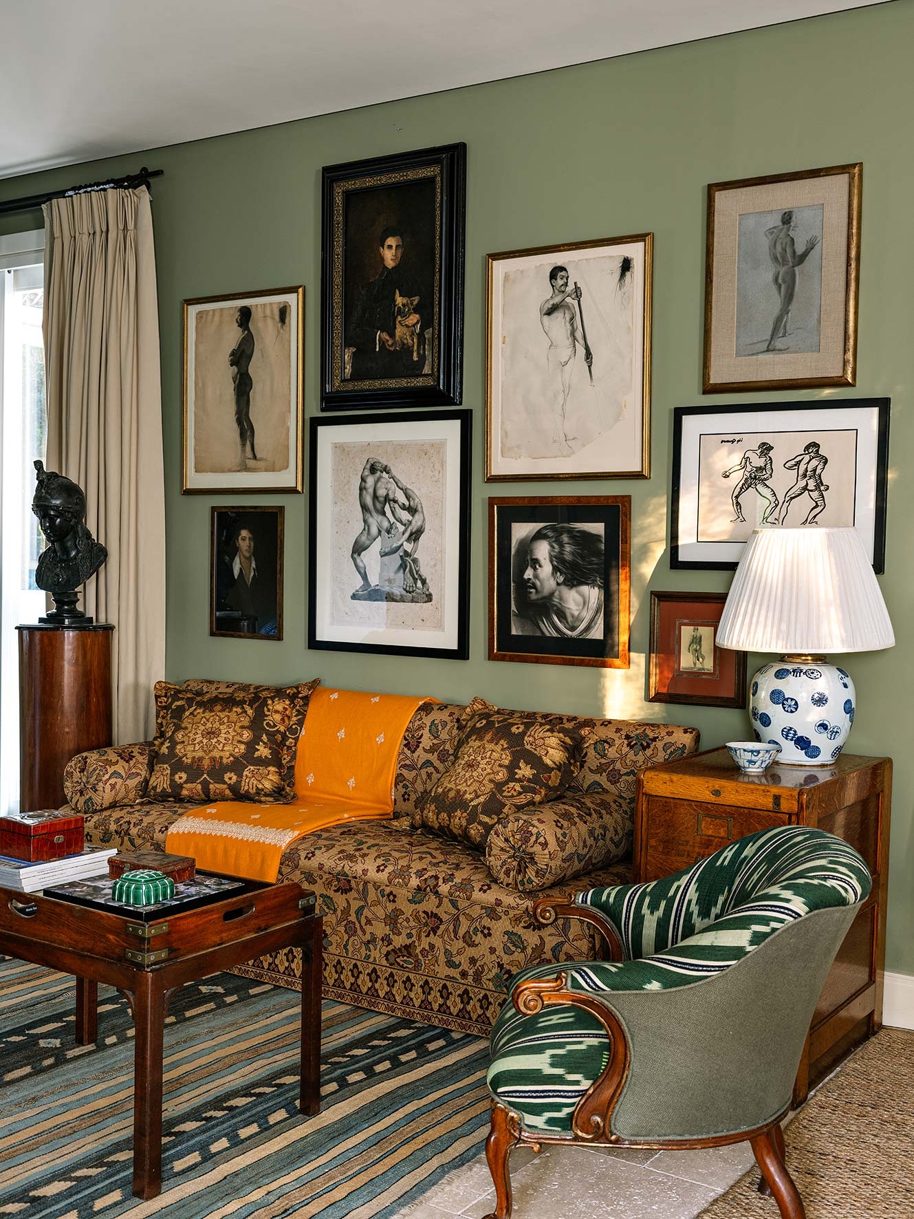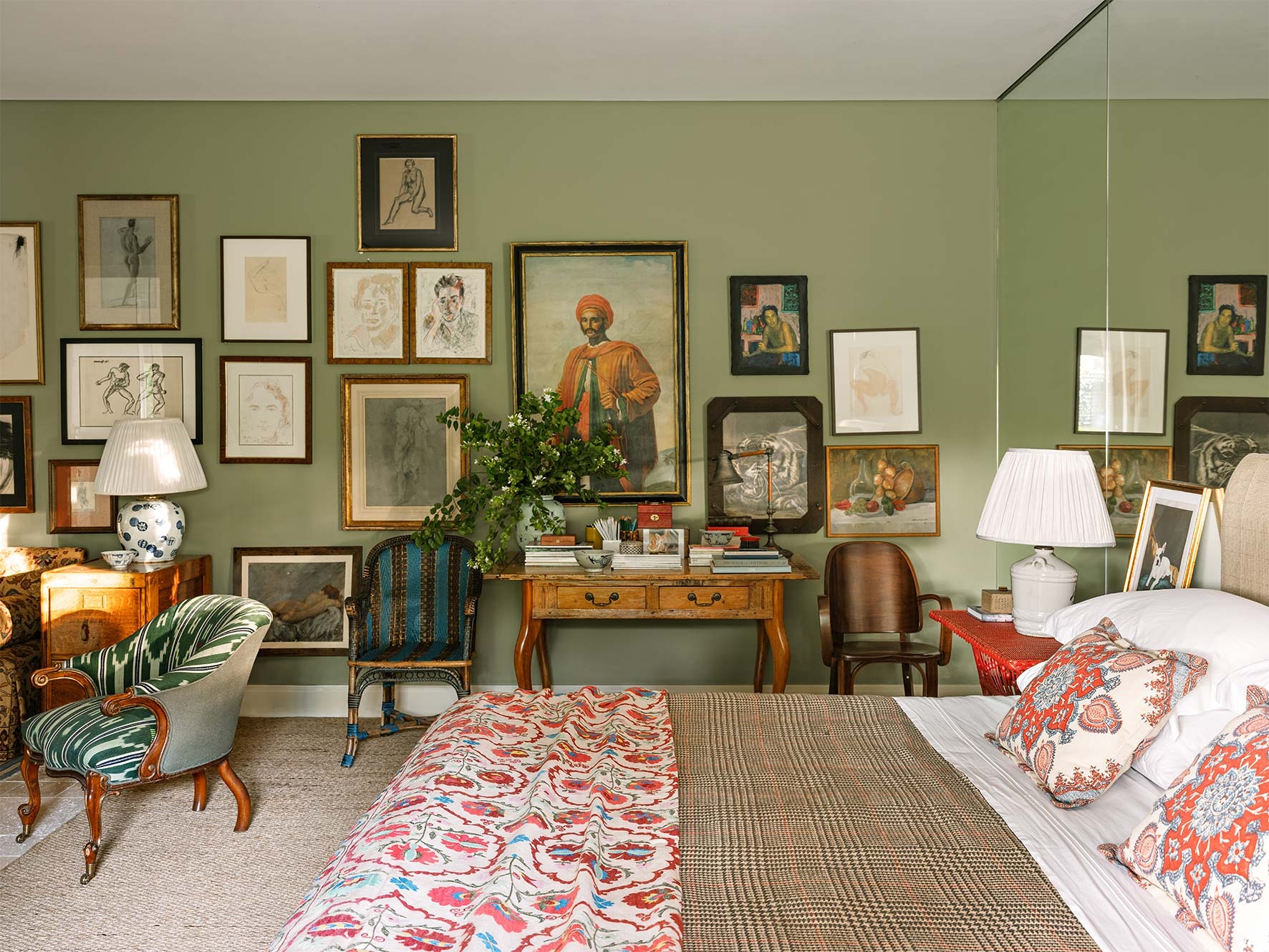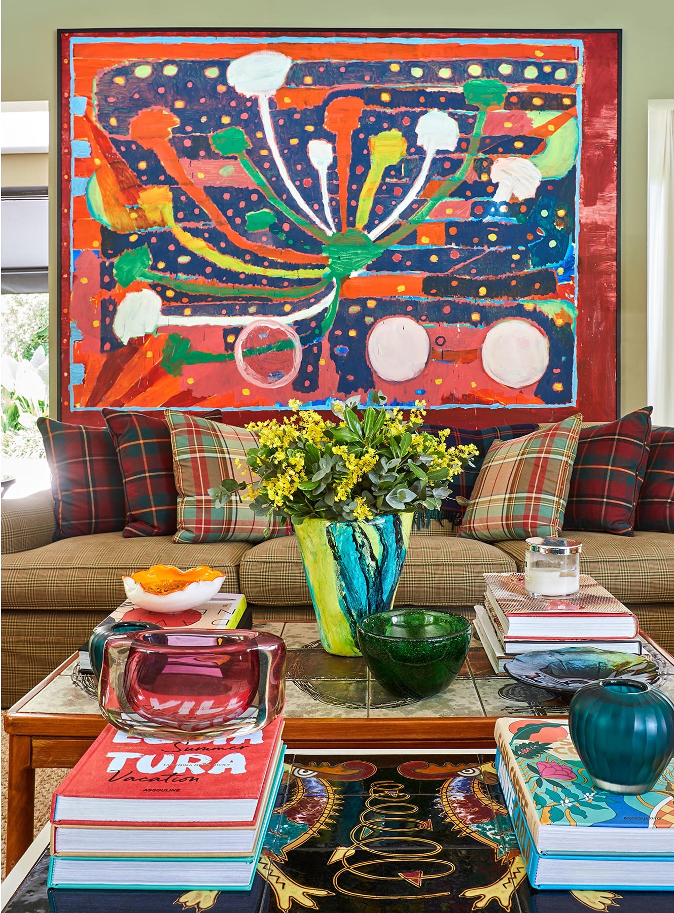 O projeto parte do repertório das casas de campo inglesas, reinterpretado por Sig Bergamin e Murilo Lomas em uma leitura contemporânea de conforto e vida ao ar livre. Desenvolvida em um único nível, a implantação privilegia a fluidez entre interior e exterior e reforça a relação direta com o jardim. A fachada em tijolos aparentes estabelece um caráter clássico, inserindo a arquitetura na paisagem. No interior, uma paleta de verdes e beges funciona como base para uma curadoria que combina arte, design e peças artesanais. Grandes pinturas contemporâneas convivem com composições de objetos, mobiliário autoral e achados de antiquário, construindo ambientes que revelam repertório e memória. No living, poltronas On e a chaise Marquesa dialogam com obras de Bruno Dunley e Rodrigo Bivar, enquanto peças de Armani Casa, Ralph Lauren e Jonathan Adler se misturam a mobiliário vintage, estruturando a composição visual. Biblioteca e áreas sociais reforçam essa sobreposição de tempos e estilos, onde o interiorismo atua como extensão da arquitetura. Externamente, cadeiras e espreguiçadeiras de metal preto com tecidos listrados organizam a área da piscina linear, integrando-se ao paisagismo de Maria João D’Orey. O conjunto define uma casa pensada para o convívio, onde arquitetura, interiores e jardim operam de forma contínua, traduzindo um modo de morar informal, sofisticado e conectado à natureza.