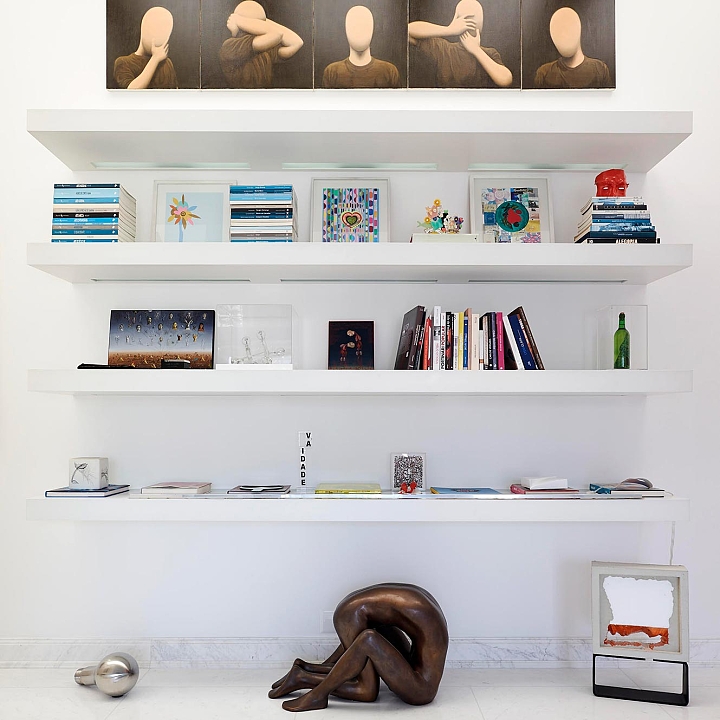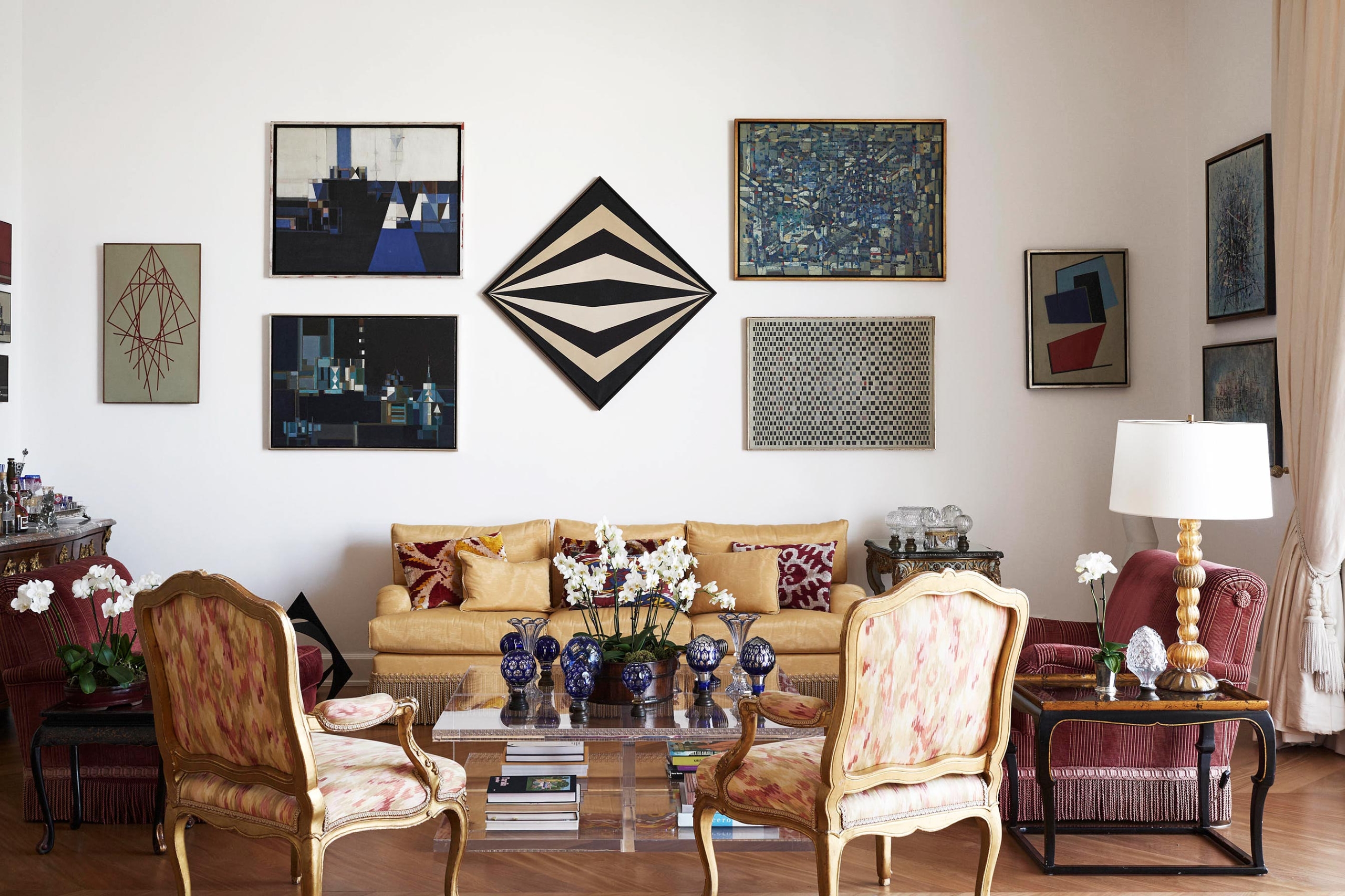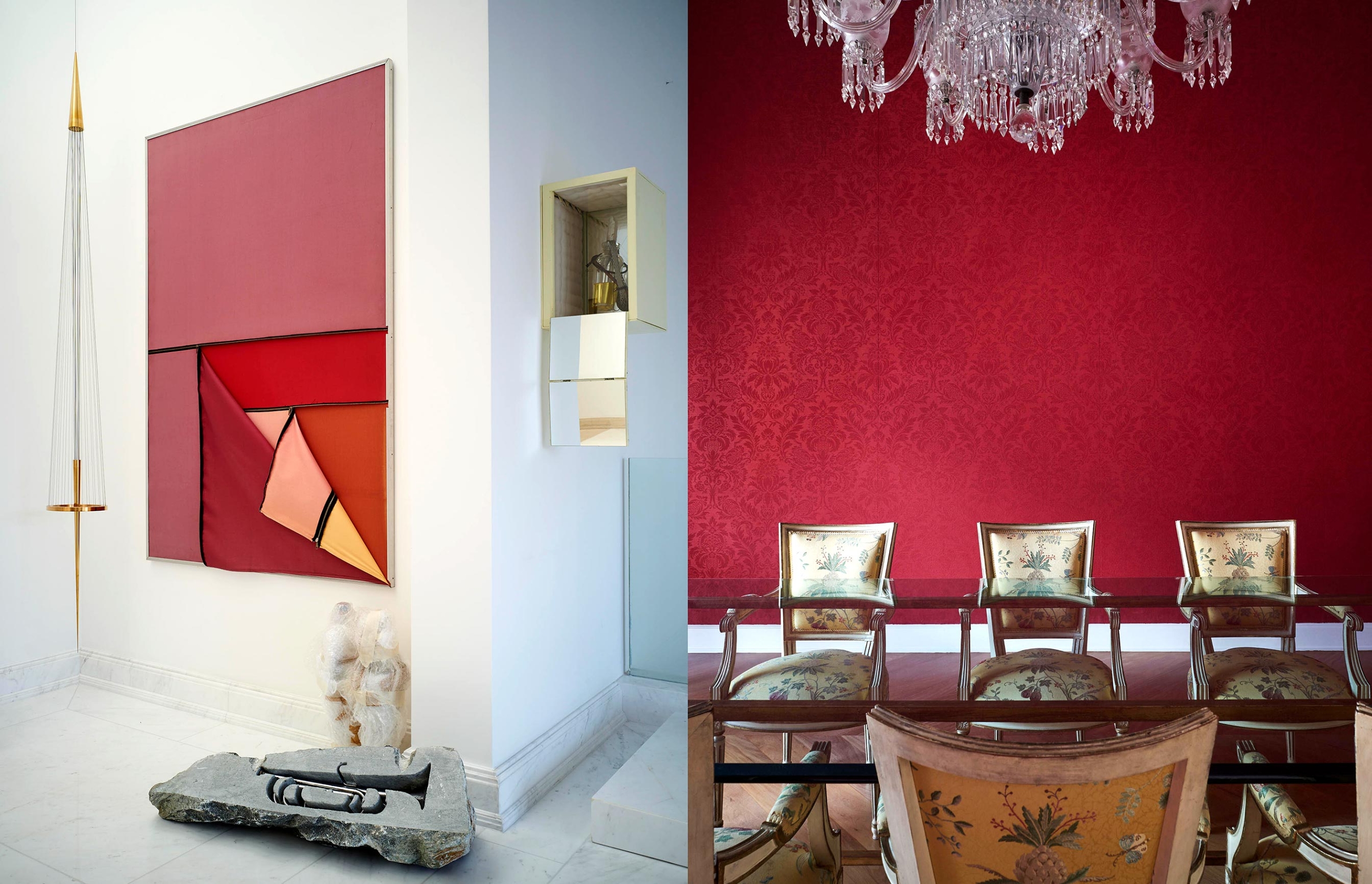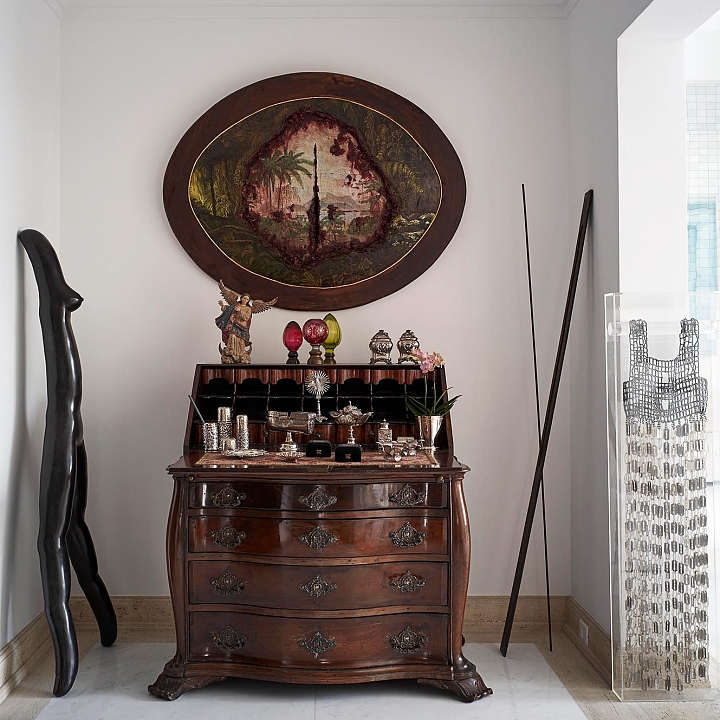 Nesta penthouse Galeria, Sig Bergamin e Murilo Lomas operam como curadores antes de operar como decoradores. O projeto parte de uma ideia simples e exigente: fazer com que a casa funcione como uma coleção em movimento, onde cada ambiente existe para sustentar a arte e, ao mesmo tempo, ser plenamente habitável. A base é clássica, com estofados generosos, proporções confortáveis e uma presença constante de peças de época, como a cômoda bombê do século 18, tratada como escultura doméstica. Sobre essa estrutura, entra a mistura calculada de mid-century e design contemporâneo, com volumes mais limpos e uma leitura gráfica que impede o conjunto de cair no “histórico” ou no “cenográfico”. A paleta trabalha o contraste entre o branco luminoso e os tons joia. Veludos em verdes profundos, vermelhos e azuis, além de padrões geométricos e ikats, criam tensão e temperatura. A sala de jantar é o golpe de cena. Paredes vermelhas estabelecem um campo cromático total, transformando o espaço em cenário. As cadeiras e a mesa entram como desenho, e a luz do cristal arremata a composição com brilho controlado.A arte, naturalmente, dita o ritmo. Nomes como Alfredo Volpi e Cícero Dias trazem a coluna vertebral moderna, enquanto Beatriz Milhazes e Adriana Varejão introduzem cor, escala e uma ideia de brasilidade sem literalidade. Julio Le Parc e Luiz Zerbini ampliam o vocabulário, entre óptica, paisagem e pulsação contemporânea. A casa vira uma sequência de enquadramentos, com paredes tratadas como curadoria e móveis escolhidos para dialogar, não para competir. Um projeto que assume o prazer da mistura, mas sustenta tudo na proporção, na textura e na clareza de olhar.