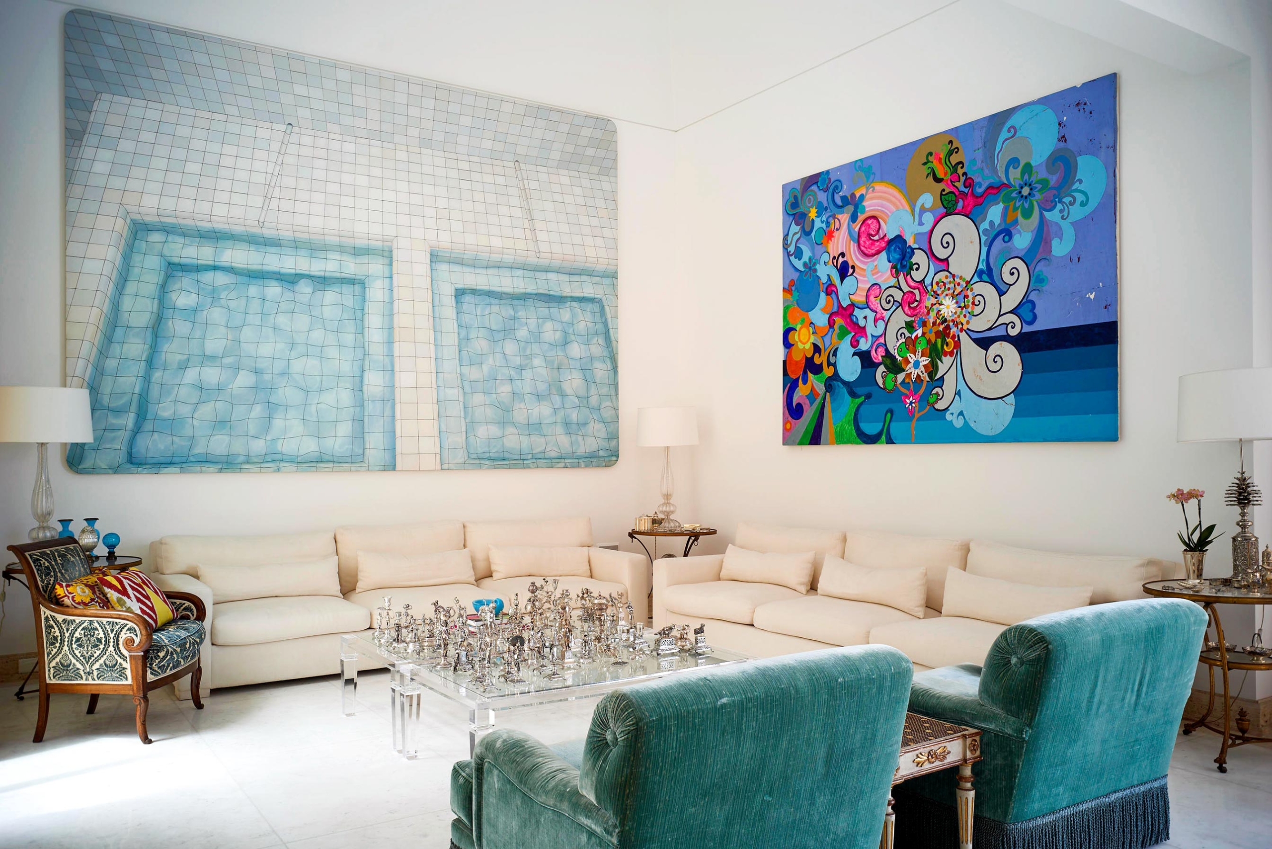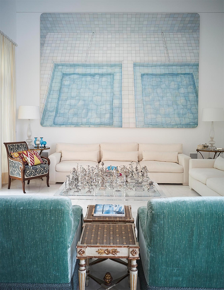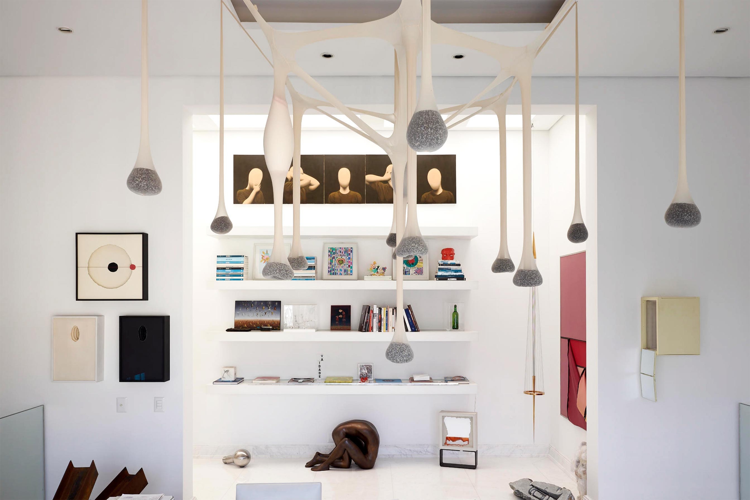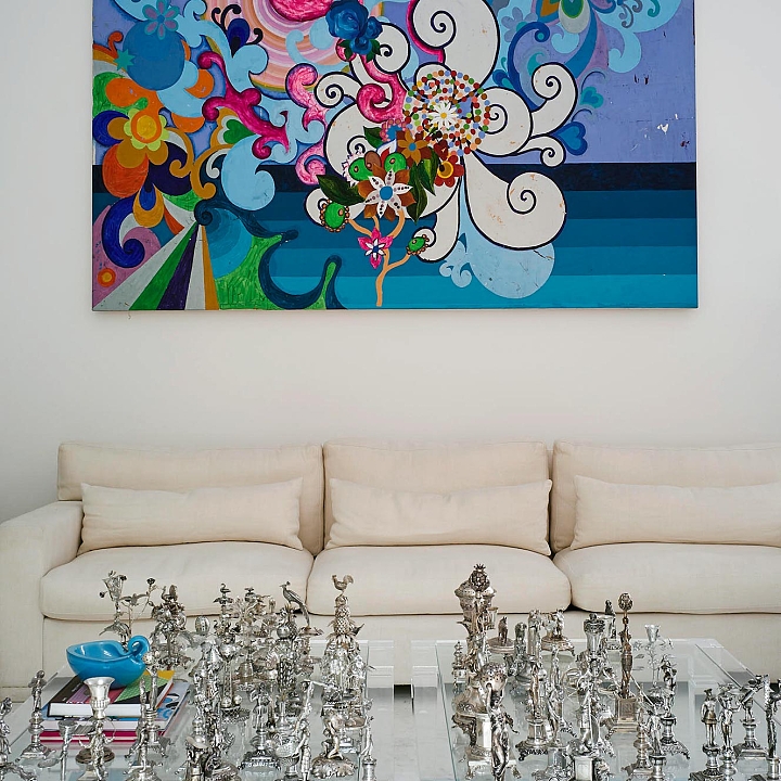 Nesta penthouse Galeria, Sig Bergamin e Murilo Lomas operam como curadores antes de operar como decoradores. O projeto parte de uma ideia simples e exigente: fazer com que a casa funcione como uma coleção em movimento, onde cada ambiente existe para sustentar a arte e, ao mesmo tempo, ser plenamente habitável. A base é clássica, com estofados generosos, proporções confortáveis e uma presença constante de peças de época, como a cômoda bombê do século 18, tratada como escultura doméstica. Sobre essa estrutura, entra a mistura calculada de mid-century e design contemporâneo, com volumes mais limpos e uma leitura gráfica que impede o conjunto de cair no “histórico” ou no “cenográfico”. A paleta trabalha o contraste entre o branco luminoso e os tons joia. Veludos em verdes profundos, vermelhos e azuis, além de padrões geométricos e ikats, criam tensão e temperatura. A sala de jantar é o golpe de cena. Paredes vermelhas estabelecem um campo cromático total, transformando o espaço em cenário. As cadeiras e a mesa entram como desenho, e a luz do cristal arremata a composição com brilho controlado.A arte, naturalmente, dita o ritmo. Nomes como Alfredo Volpi e Cícero Dias trazem a coluna vertebral moderna, enquanto Beatriz Milhazes e Adriana Varejão introduzem cor, escala e uma ideia de brasilidade sem literalidade. Julio Le Parc e Luiz Zerbini ampliam o vocabulário, entre óptica, paisagem e pulsação contemporânea. A casa vira uma sequência de enquadramentos, com paredes tratadas como curadoria e móveis escolhidos para dialogar, não para competir. Um projeto que assume o prazer da mistura, mas sustenta tudo na proporção, na textura e na clareza de olhar.
