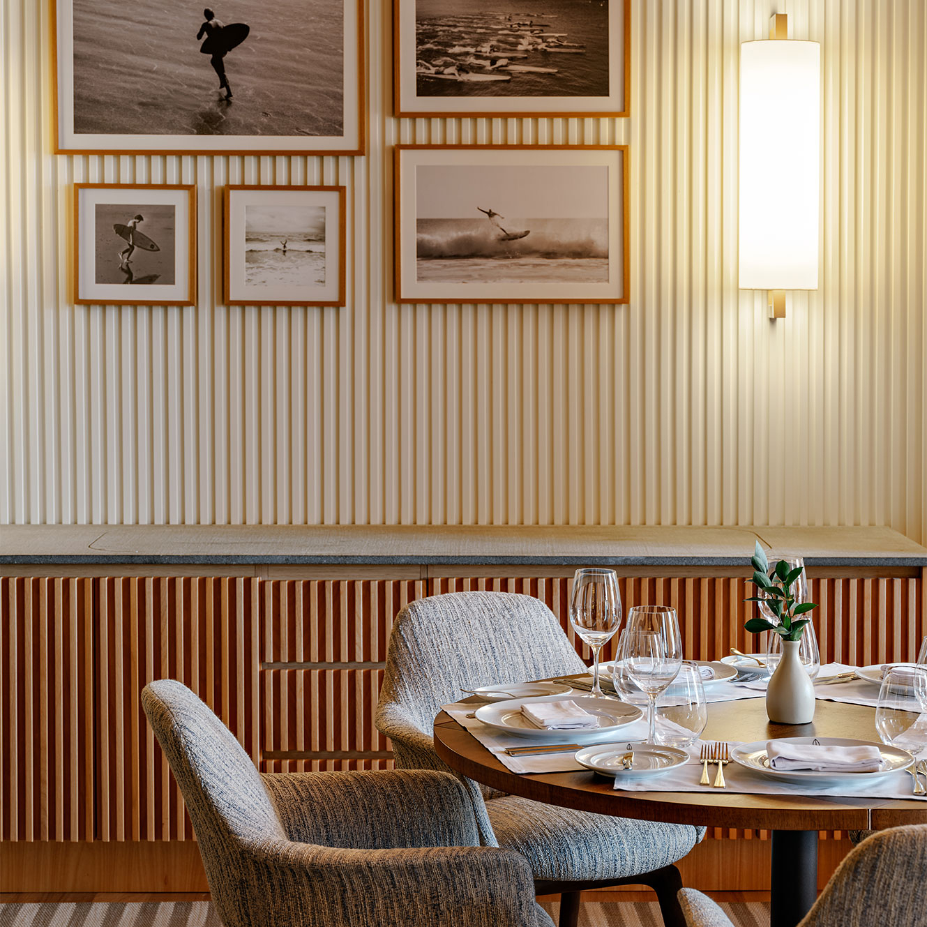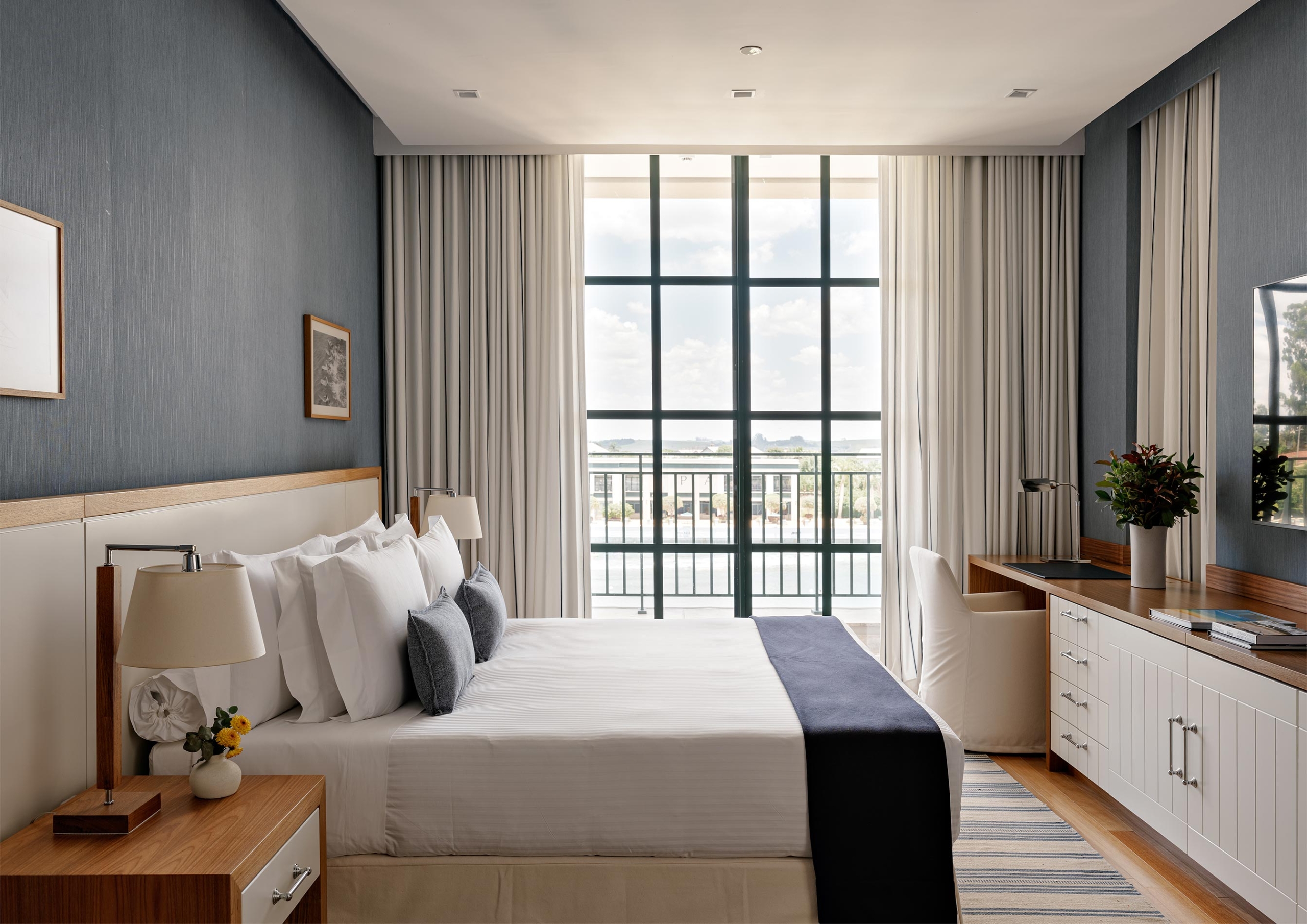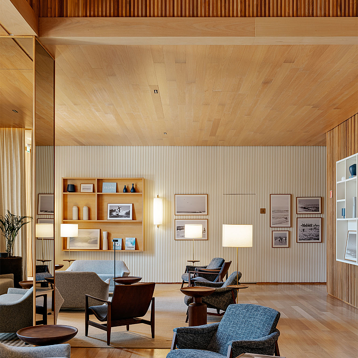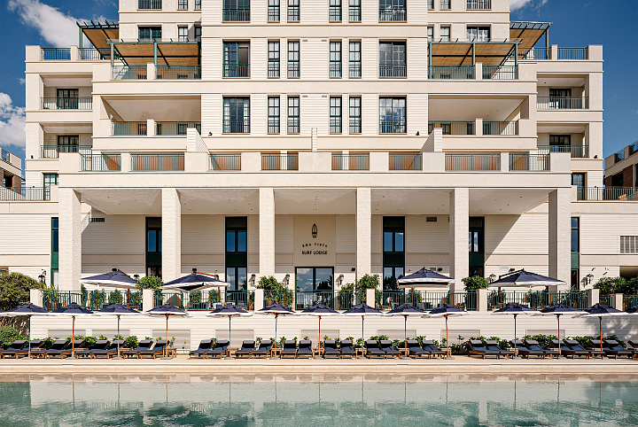 No Boa Vista Surf Lodge, a arquitetura estabelece uma mediação precisa entre paisagem, esporte e experiência. Implantado no coração do Boa Vista Village, em Porto Feliz, o projeto organiza o conjunto como uma sequência de volumes baixos e abertos, favorecendo circulação fluida, integração visual e uma relação contínua com o exterior. A piscina de ondas atua como eixo estruturador do espaço e da vivência coletiva, mais do que como atração isolada. A linguagem arquitetônica privilegia proporções equilibradas, materiais naturais e uma leitura contemporânea que valoriza o tempo lento do lugar. Varandas generosas, transparências controladas e áreas de convivência abertas reforçam a ideia de observação e encontro, elementos centrais na cultura do surfe, criando um refúgio que transcende o modelo tradicional de hotelaria. Em diálogo direto com os interiores assinados por Sig Bergamin & Murilo Lomas, a atmosfera do lodge é definida por uma paleta de azuis suaves, off-whites e madeira natural, evocando um litoral imaginado no interior paulista. A referência ao imaginário dos Hamptons surge de forma sensível, não como citação literal, mas como afinidade estética marcada por leveza, elegância e informalidade sofisticada. Fotografias vintage de surfe e superfícies claras reforçam esse clima de frescor e atemporalidade. O resultado é um conjunto coeso, onde arquitetura, interiores e paisagem operam em sintonia para criar uma experiência que é simultaneamente esportiva, contemplativa e refinada. No Boa Vista Surf Lodge, o espaço não se impõe: ele conduz, acolhe e permanece na memória.
