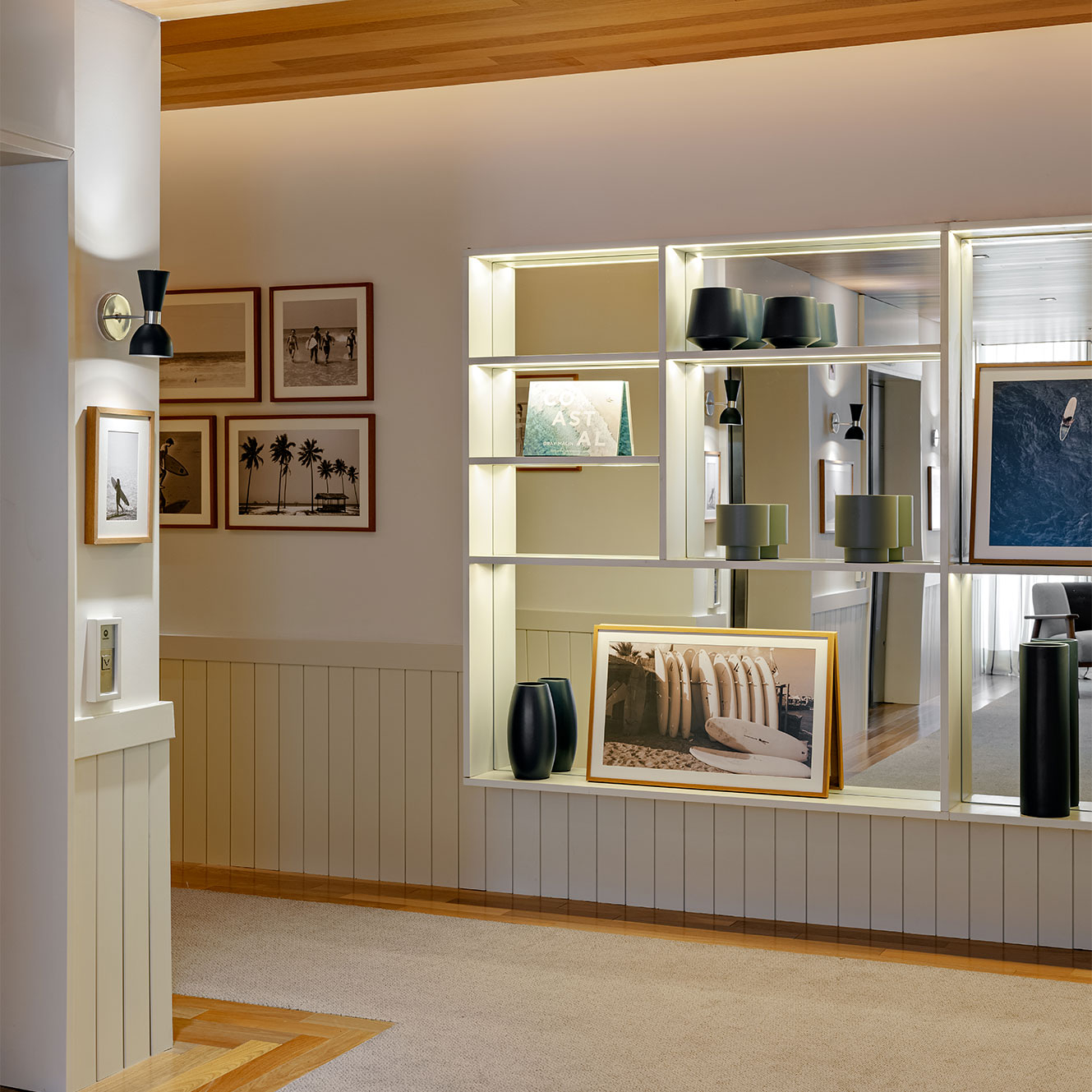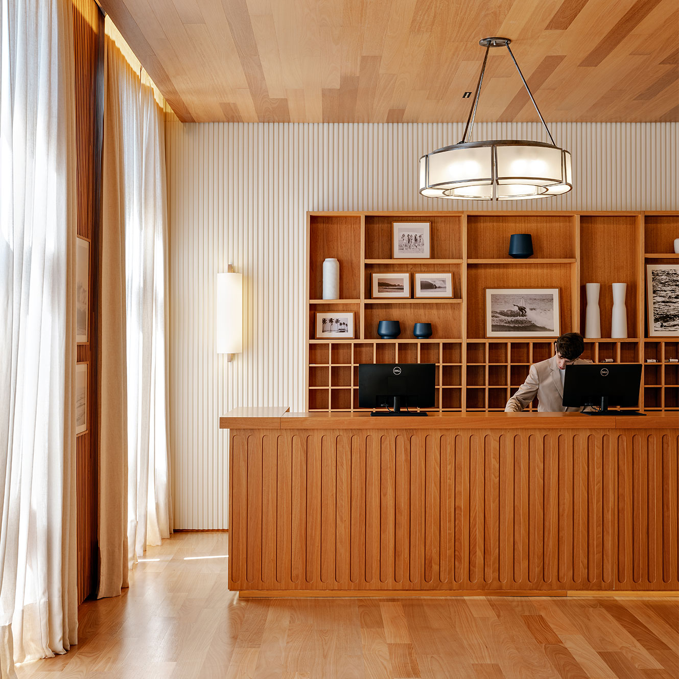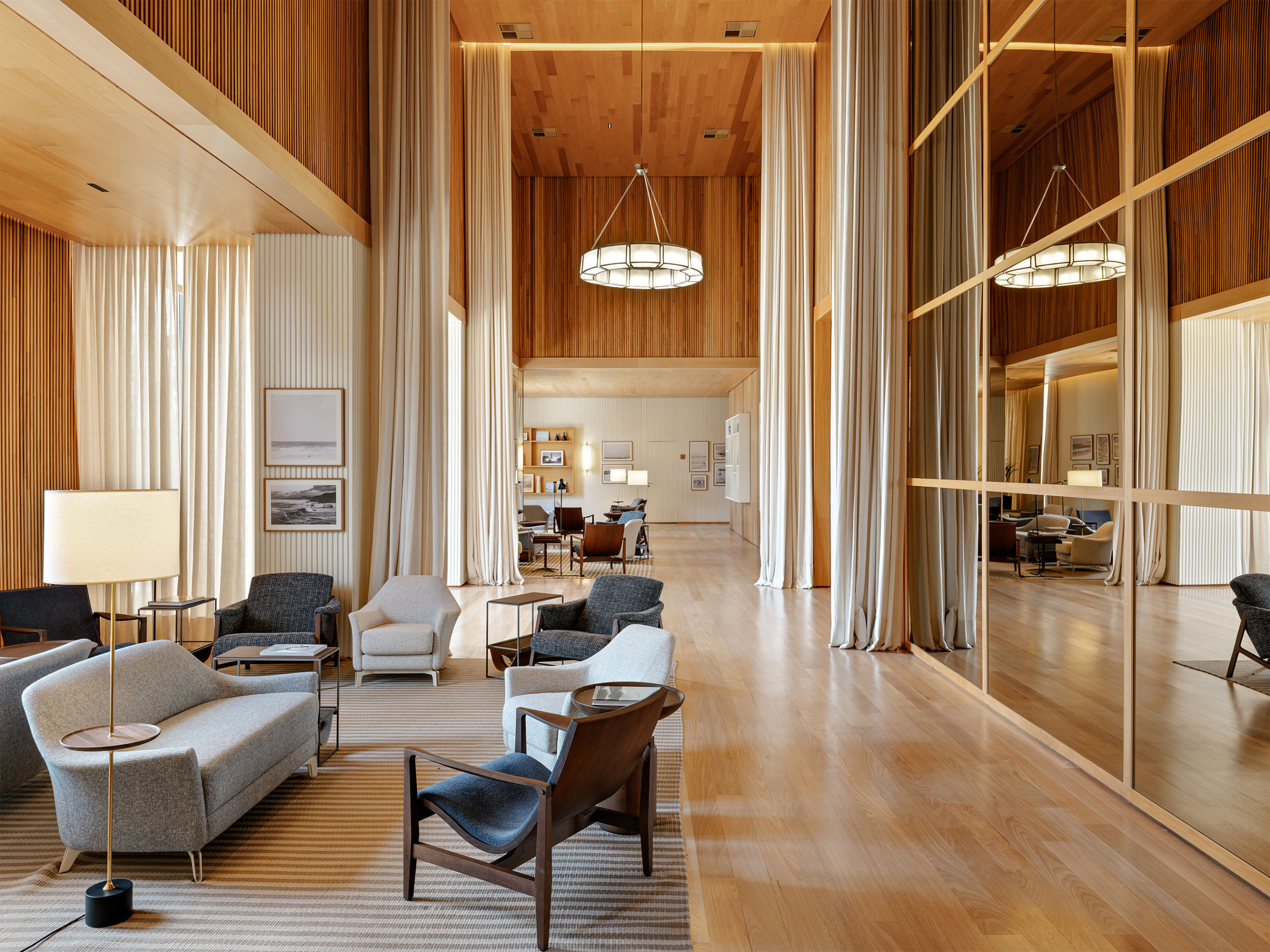 No Boa Vista Surf Lodge, a arquitetura estabelece uma mediação precisa entre paisagem, esporte e experiência. Implantado no coração do Boa Vista Village, em Porto Feliz, o projeto organiza o conjunto como uma sequência de volumes baixos e abertos, favorecendo circulação fluida, integração visual e uma relação contínua com o exterior. A piscina de ondas atua como eixo estruturador do espaço e da vivência coletiva, mais do que como atração isolada. A linguagem arquitetônica privilegia proporções equilibradas, materiais naturais e uma leitura contemporânea que valoriza o tempo lento do lugar. Varandas generosas, transparências controladas e áreas de convivência abertas reforçam a ideia de observação e encontro, elementos centrais na cultura do surfe, criando um refúgio que transcende o modelo tradicional de hotelaria. Em diálogo direto com os interiores assinados por Sig Bergamin & Murilo Lomas, a atmosfera do lodge é definida por uma paleta de azuis suaves, off-whites e madeira natural, evocando um litoral imaginado no interior paulista. A referência ao imaginário dos Hamptons surge de forma sensível, não como citação literal, mas como afinidade estética marcada por leveza, elegância e informalidade sofisticada. Fotografias vintage de surfe e superfícies claras reforçam esse clima de frescor e atemporalidade. O resultado é um conjunto coeso, onde arquitetura, interiores e paisagem operam em sintonia para criar uma experiência que é simultaneamente esportiva, contemplativa e refinada. No Boa Vista Surf Lodge, o espaço não se impõe: ele conduz, acolhe e permanece na memória.