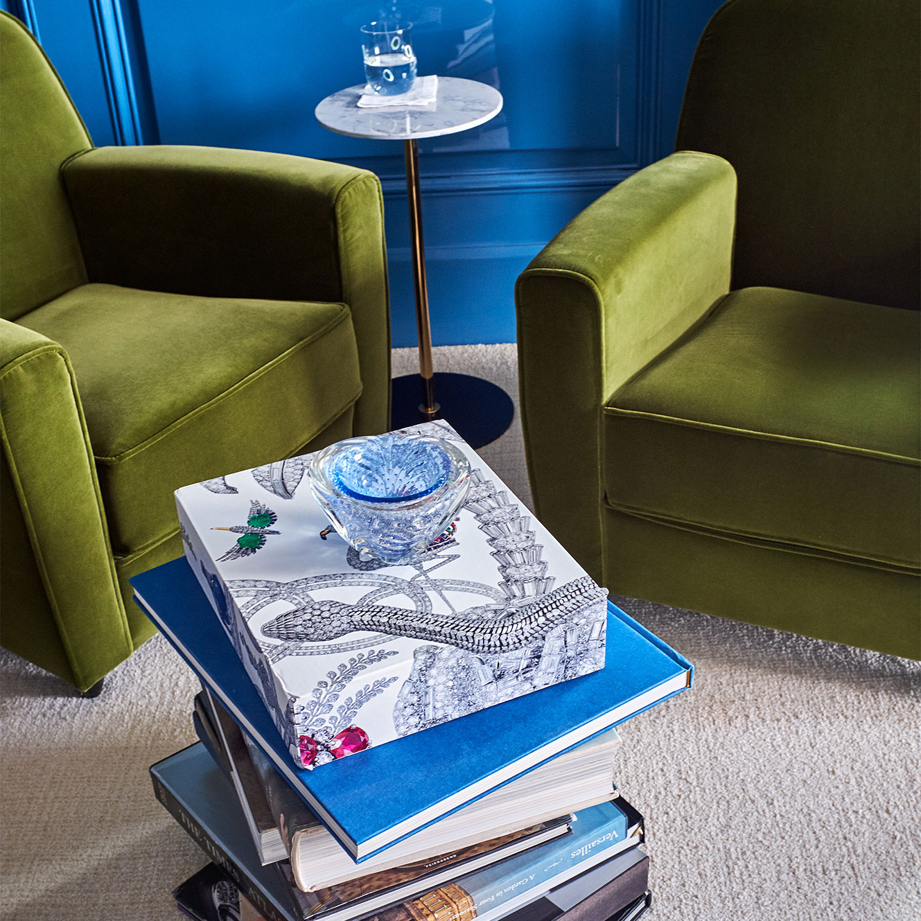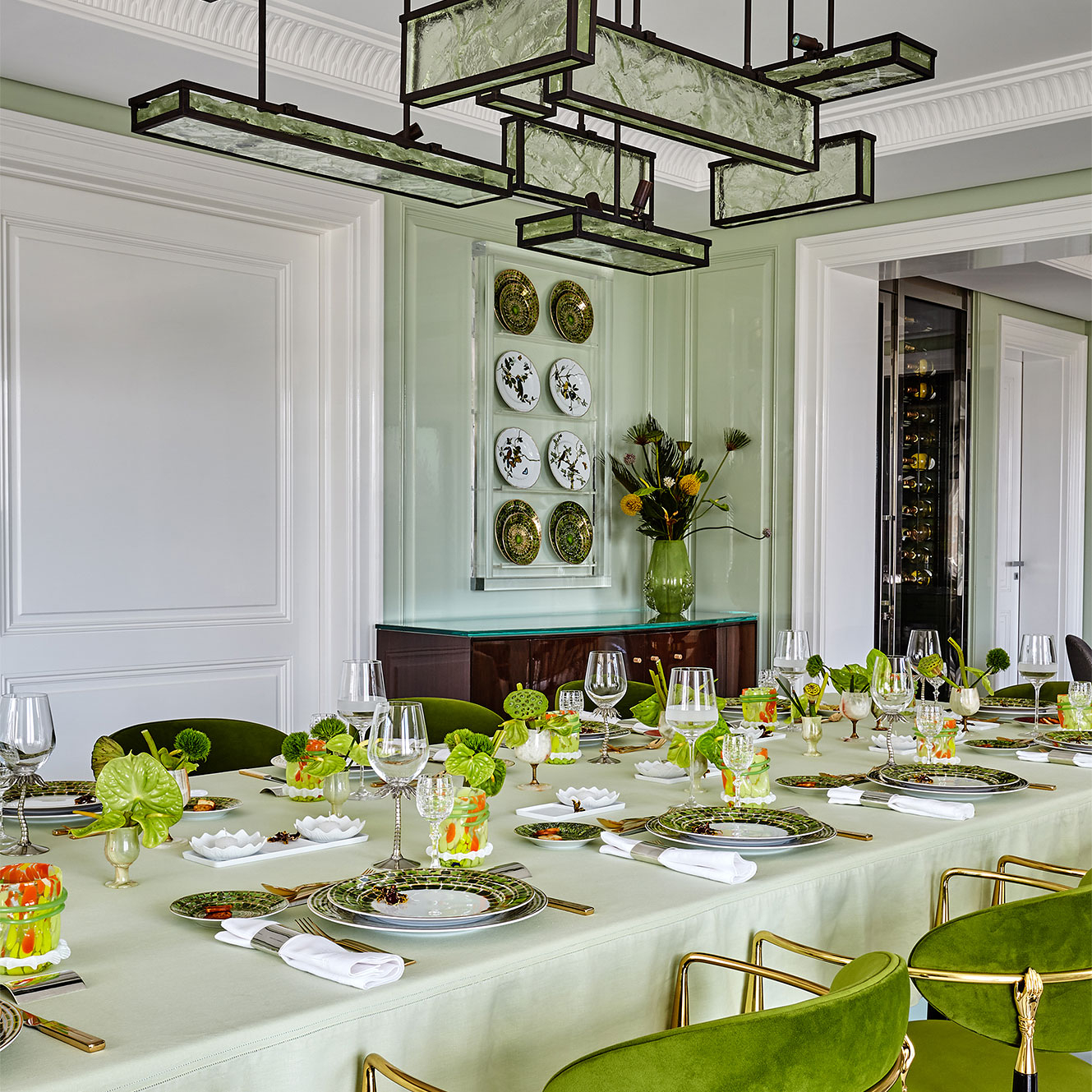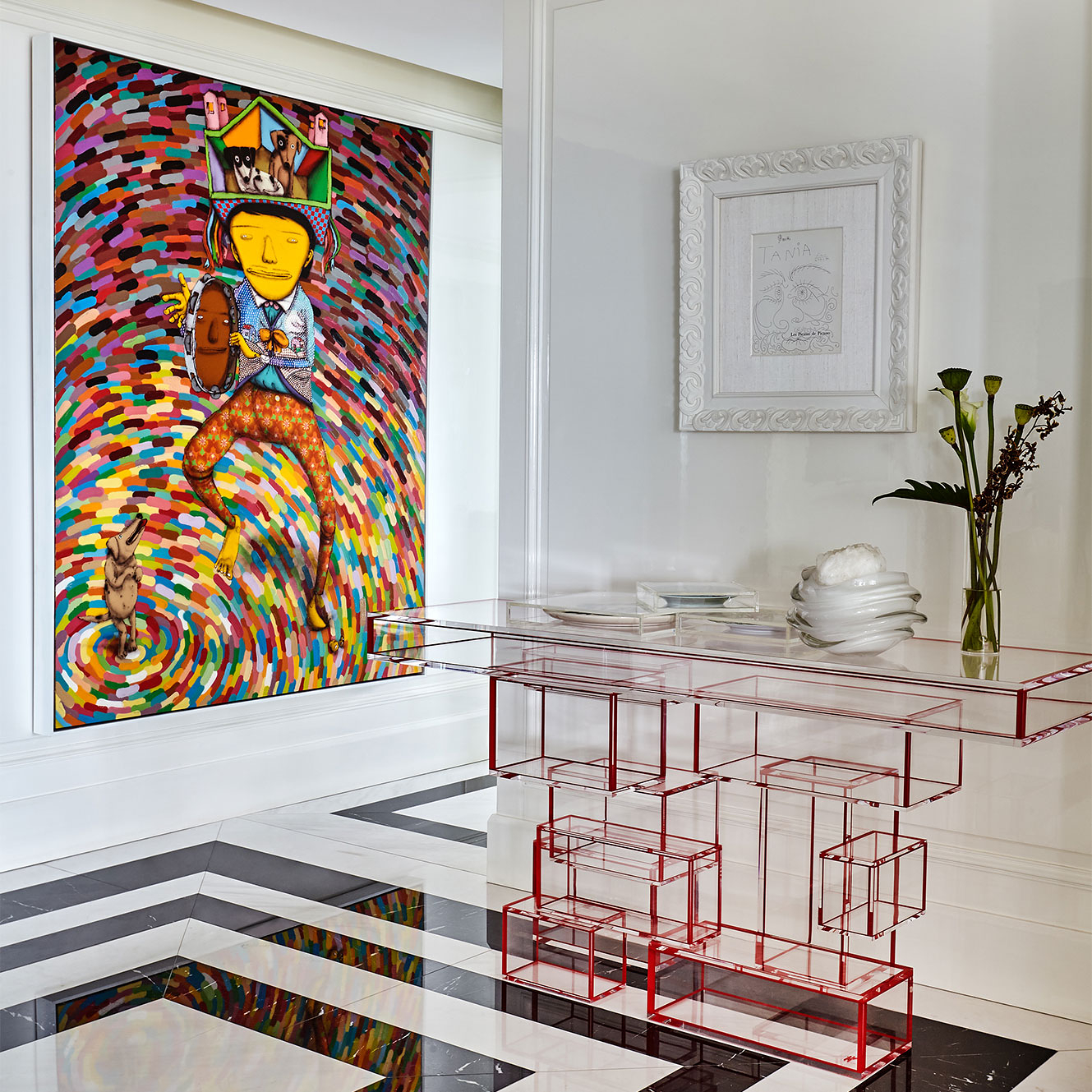 Urbano e cosmopolita, este apartamento constrói seu impacto a partir de uma base clássica em preto e off-white, sobre a qual arte e mobiliário assumem protagonismo com clareza curatorial. O interior se organiza em cenas nas quais obra, peça e acabamento compartilham o mesmo peso. No hall de entrada, o aparador geométrico de Hervé Van der Straeten dialoga com o piso de mármore em paginação linear, definindo um ponto de tensão reforçado por obra de Os Gêmeos. A combinação entre desenho, materialidade e escala introduz o vocabulário do projeto. No escritório-biblioteca, a marcenaria em azul envolve o ambiente e organiza livros, objetos e arte. A escrivaninha em ébano com acabamento dourado se articula com poltrona executiva em couro off-white e cadeira de acrílico estofada em veludo azul, calibrando o contraste entre peso material e transparência. Nos ambientes de convívio, o verde funciona como fio condutor. Poltronas em veludo verde dialogam com planos de cor, enquanto mesas de mármore e objetos em vidro atuam como pausas gráficas. No bar, esse registro se intensifica na marcenaria detalhada e no mármore de veios marcados. Na sala de jantar, poltronas de design italiano revestidas em veludo verde estruturam a composição ao redor da mesa, enquanto o lustre escultórico em vidro e bronze trata a luz como elemento arquitetônico. Intervenções em acrílico vermelho introduzem ritmo contemporâneo sem romper a unidade do conjunto. O resultado é um interior autoral.