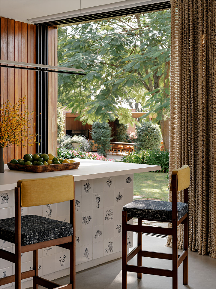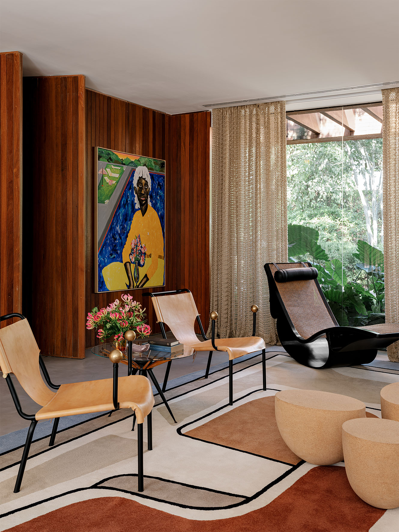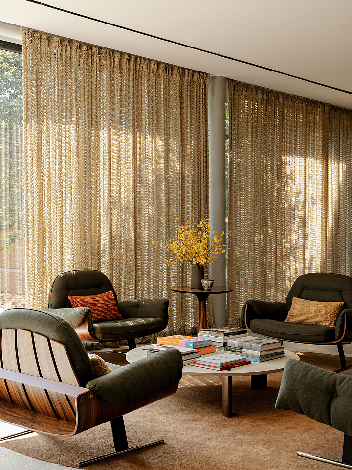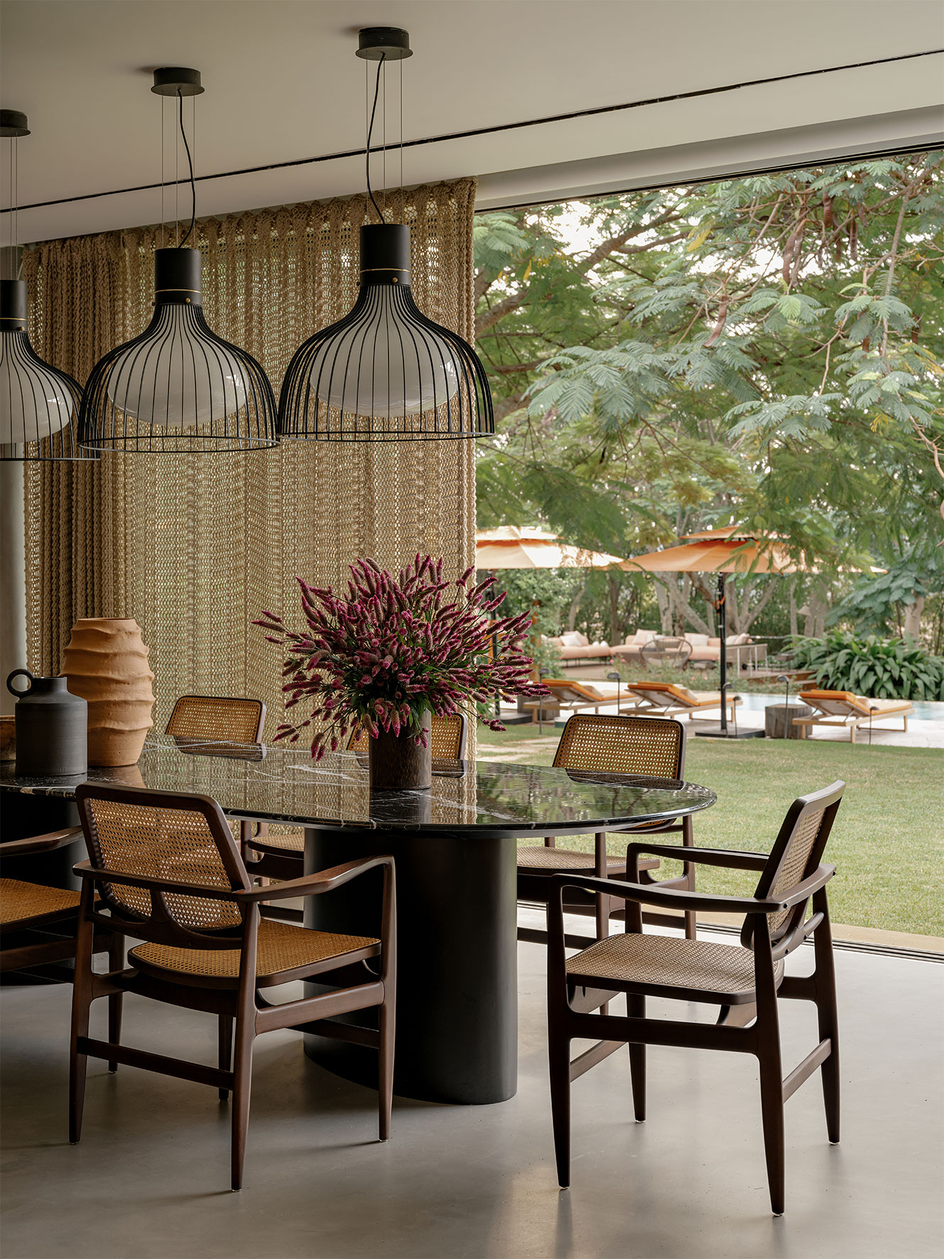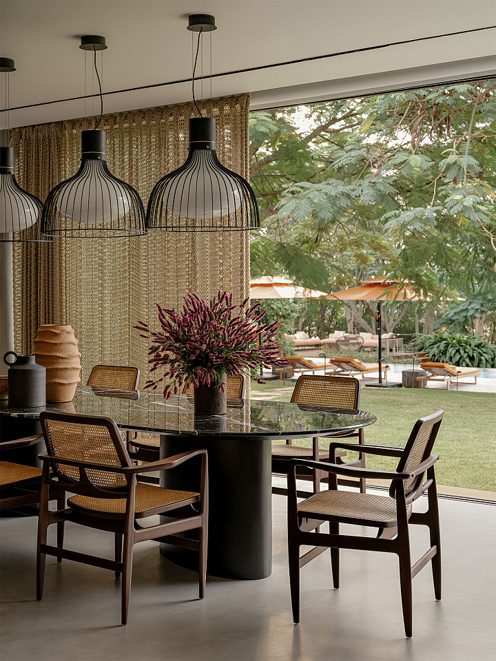 Concebida como refúgio de fim de semana, esta residência de campo assinada por Sig Bergamin e Murilo Lomas propõe uma leitura da cultura brasileira com foco em identidade, autenticidade e conforto, refletindo o estilo de vida dos moradores e sua ligação com raízes baianas e familiares.A arquitetura se abre para os jardins com pérgulas de madeira, decks e grandes portas de correr que integram living e varanda. Espreguiçadeiras de cedro com almofadas terracota ladeiam a piscina, enquanto cortinas de macramê filtram a luz na transição entre interior e exterior. No interior, a madeira conduz a materialidade em estruturas, revestimentos e mobiliário. A paleta combina terracota, beges, verdes e azuis, em diálogo com obras de Os Gêmeos, Zé Palito, Alberto Pitta e a tapeçaria de Genaro de Carvalho. O mobiliário reúne diferentes gerações do design brasileiro, com peças de Zanine Caldas, Lina Bo Bardi, Jorge Zalszupin, Jader Almeida e Ricardo Van Steen, além de elementos artesanais e tecidos selecionados. Poltronas de madeira curvilínea, cadeiras com palhinha, mesas baixas em cortiça e tapetes de desenhos fluidos organizam os ambientes. Objetos em vidro soprado, muranos coloridos e bronzes pontuam os espaços. O resultado é um interior em que arquitetura, arte e design operam de forma integrada, celebrando o encontro entre paisagem, cultura brasileira e convívio.