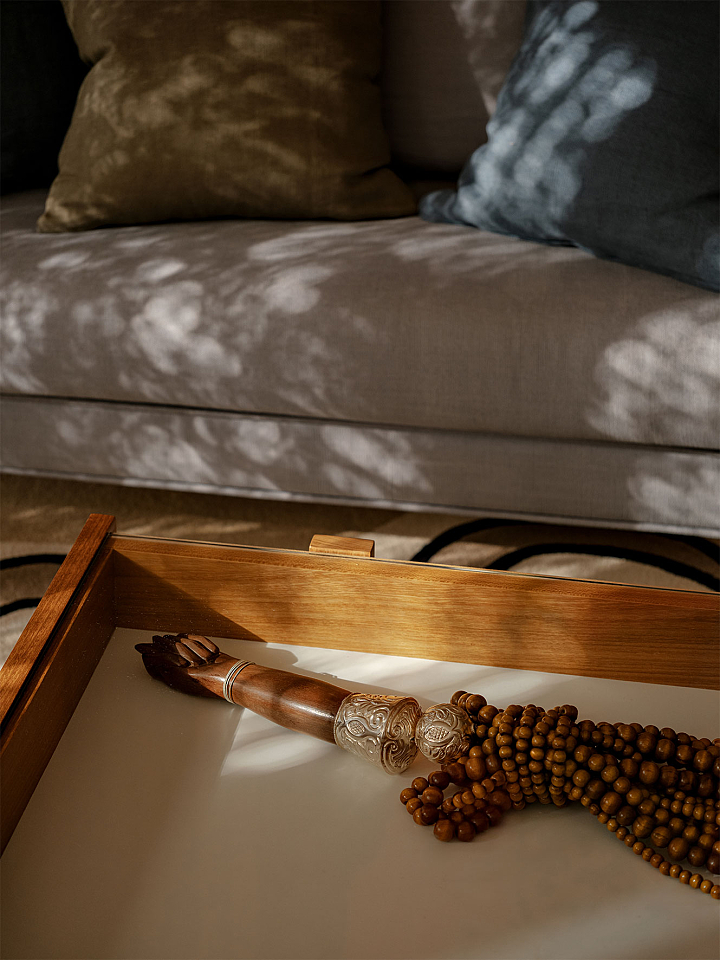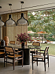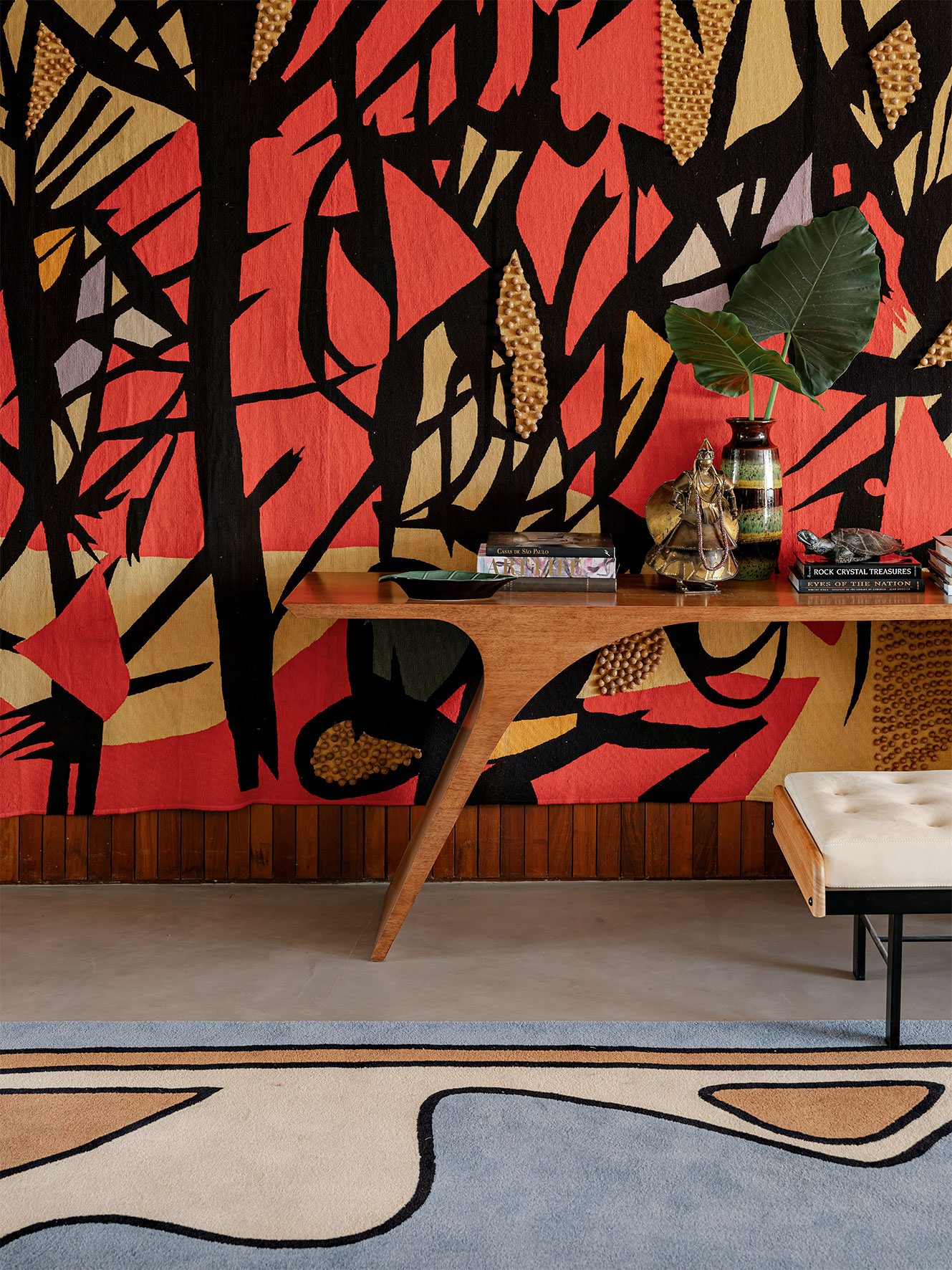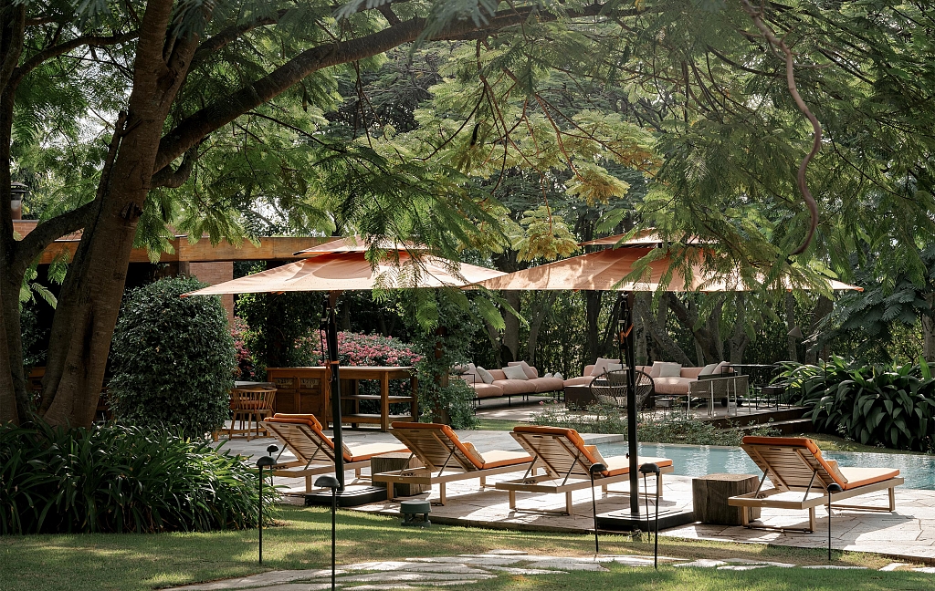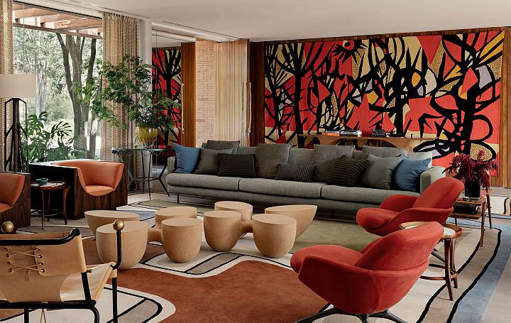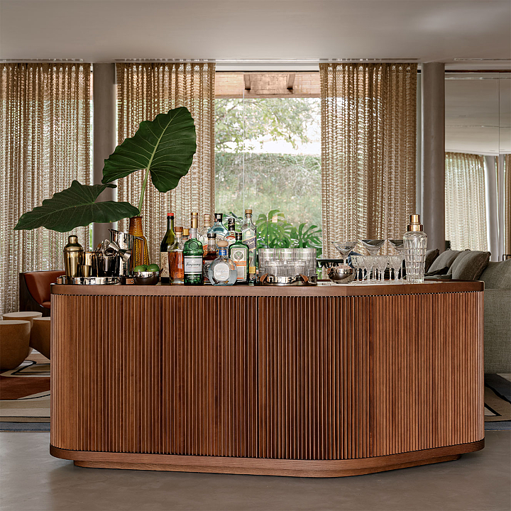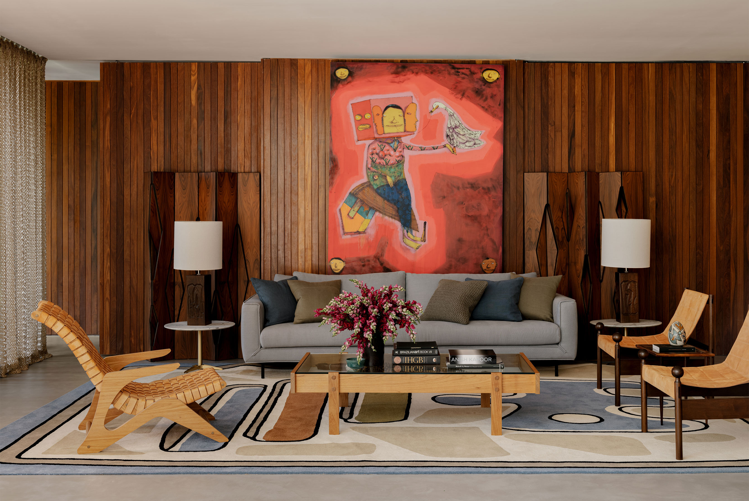 Concebida como refúgio de fim de semana, esta residência de campo assinada por Sig Bergamin e Murilo Lomas propõe uma leitura da cultura brasileira com foco em identidade, autenticidade e conforto, refletindo o estilo de vida dos moradores e sua ligação com raízes baianas e familiares.A arquitetura se abre para os jardins com pérgulas de madeira, decks e grandes portas de correr que integram living e varanda. Espreguiçadeiras de cedro com almofadas terracota ladeiam a piscina, enquanto cortinas de macramê filtram a luz na transição entre interior e exterior. No interior, a madeira conduz a materialidade em estruturas, revestimentos e mobiliário. A paleta combina terracota, beges, verdes e azuis, em diálogo com obras de Os Gêmeos, Zé Palito, Alberto Pitta e a tapeçaria de Genaro de Carvalho. O mobiliário reúne diferentes gerações do design brasileiro, com peças de Zanine Caldas, Lina Bo Bardi, Jorge Zalszupin, Jader Almeida e Ricardo Van Steen, além de elementos artesanais e tecidos selecionados. Poltronas de madeira curvilínea, cadeiras com palhinha, mesas baixas em cortiça e tapetes de desenhos fluidos organizam os ambientes. Objetos em vidro soprado, muranos coloridos e bronzes pontuam os espaços. O resultado é um interior em que arquitetura, arte e design operam de forma integrada, celebrando o encontro entre paisagem, cultura brasileira e convívio.